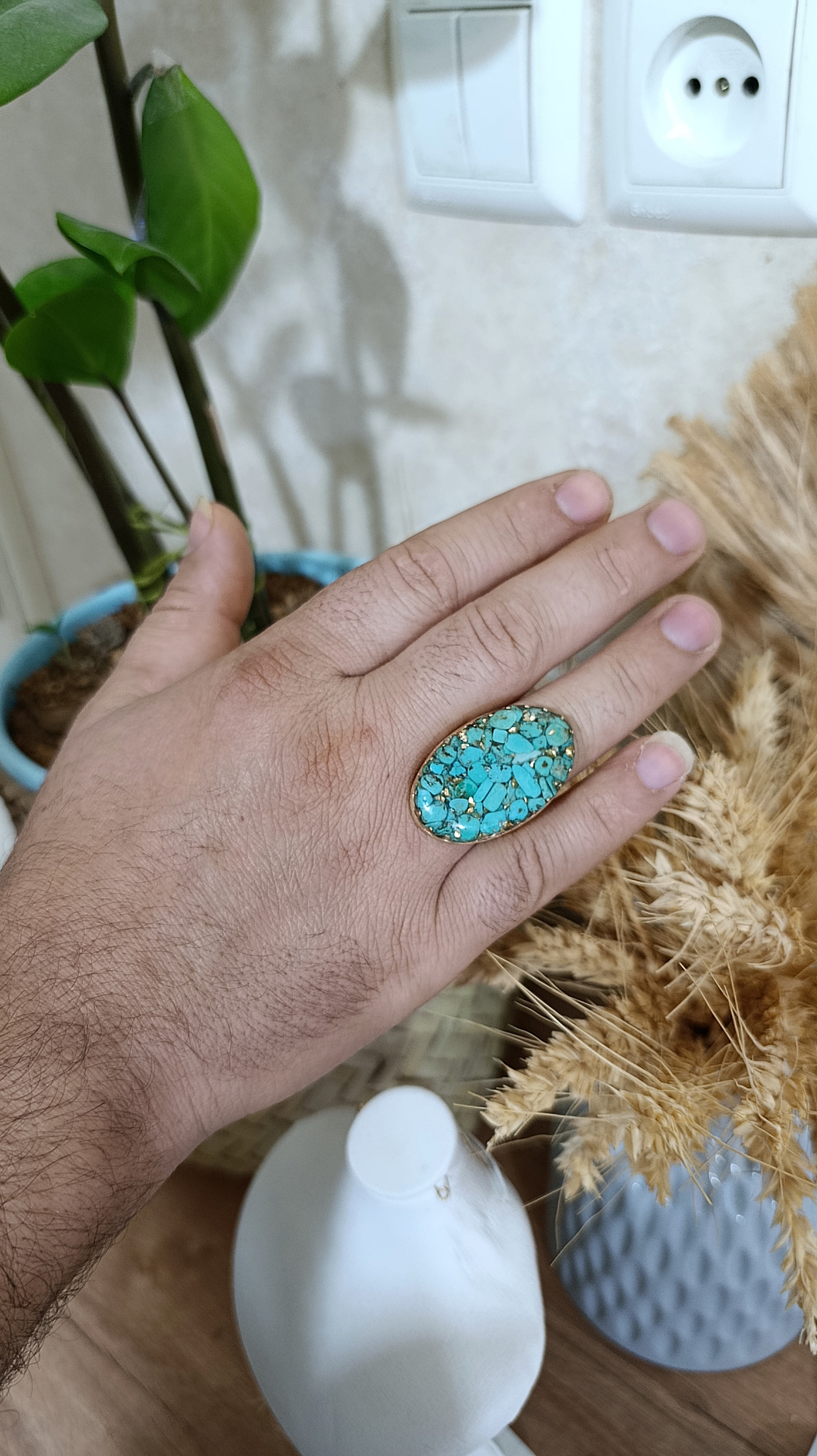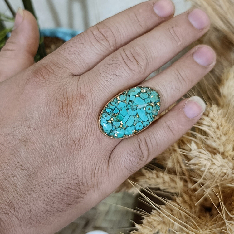 زیو آلات خاص فروشگاه عجم استور با خردهسنگهای فیروزه تبتی یا آفریقایی ساخته شده و با رزین شفاف فیکس شده تا جلوهای درخشان و ماندگار داشته باشد.