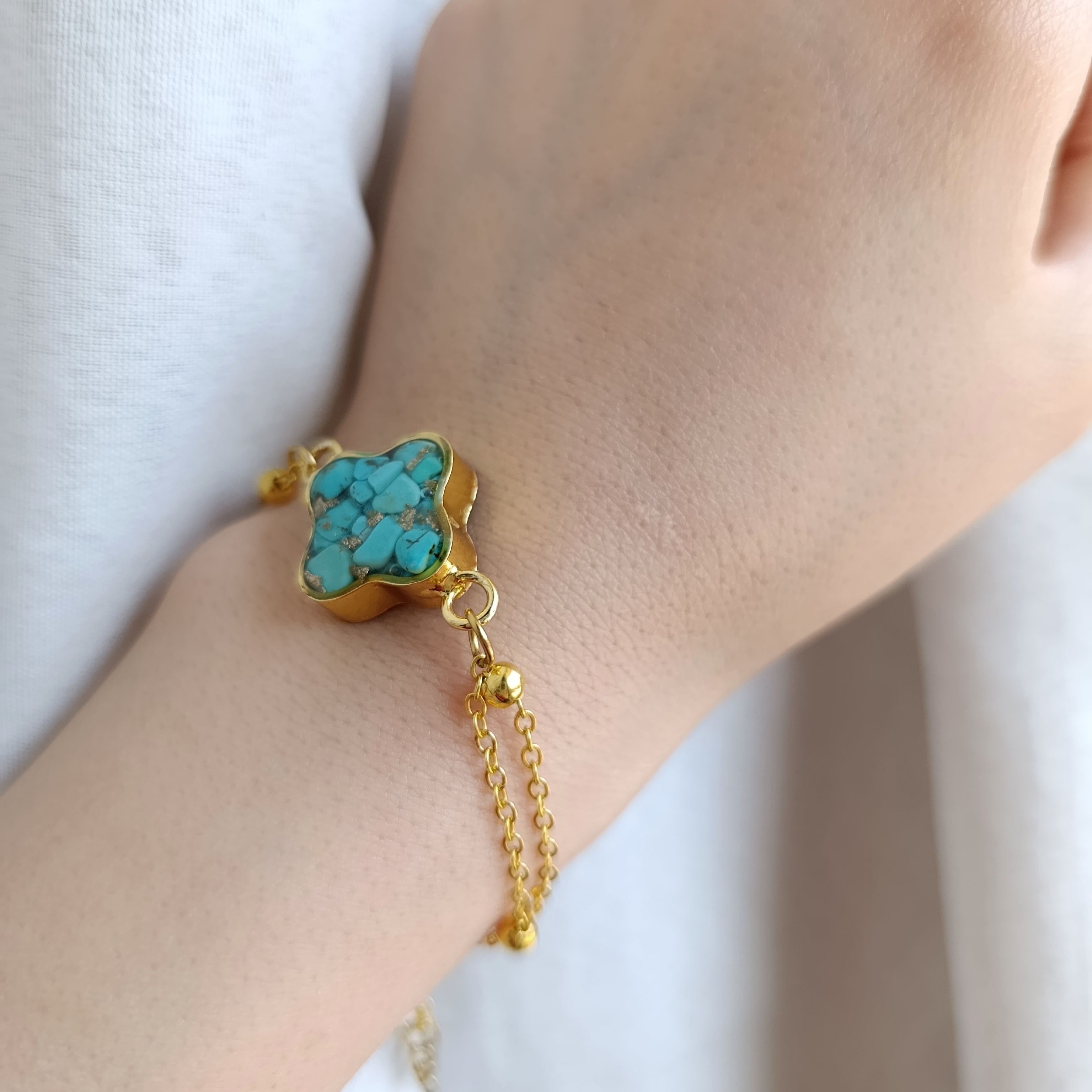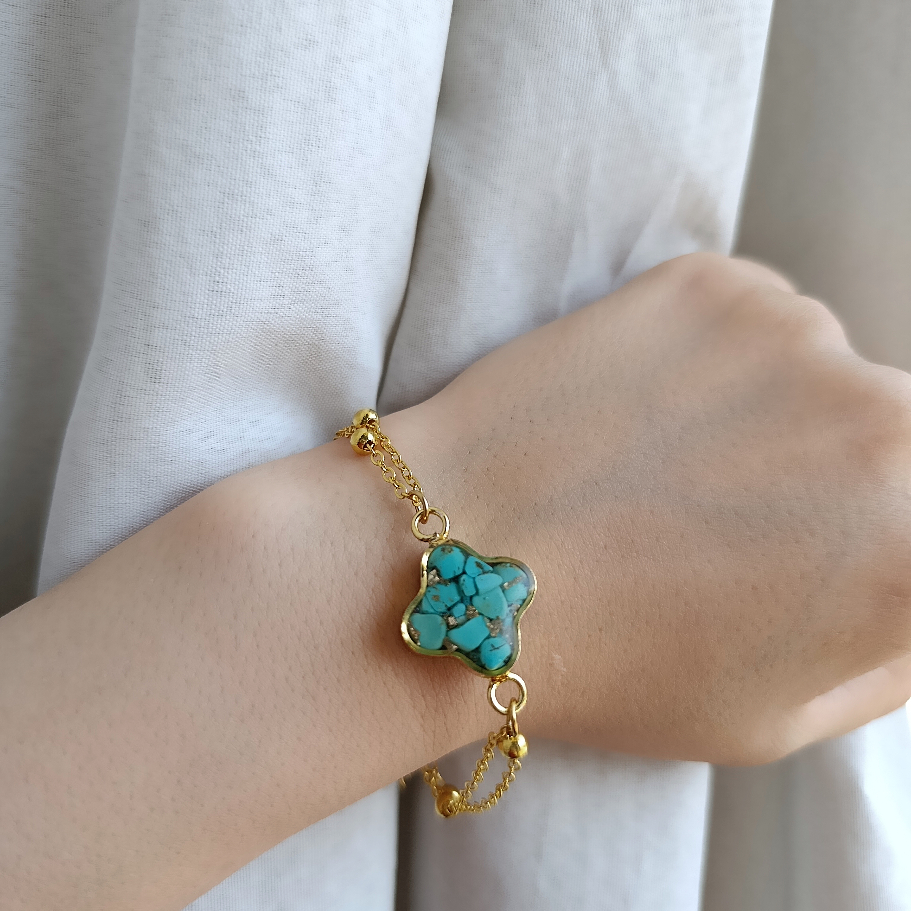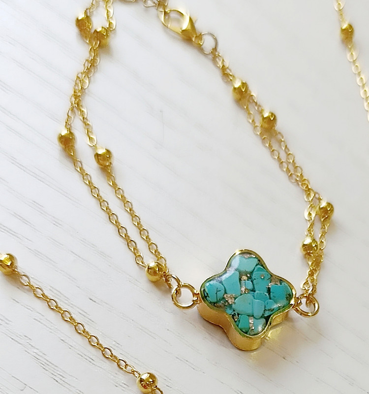 زیو آلات خاص فروشگاه عجم استور با خردهسنگهای فیروزه تبتی یا آفریقایی ساخته شده و با رزین شفاف فیکس شده تا جلوهای درخشان و ماندگار داشته باشد.