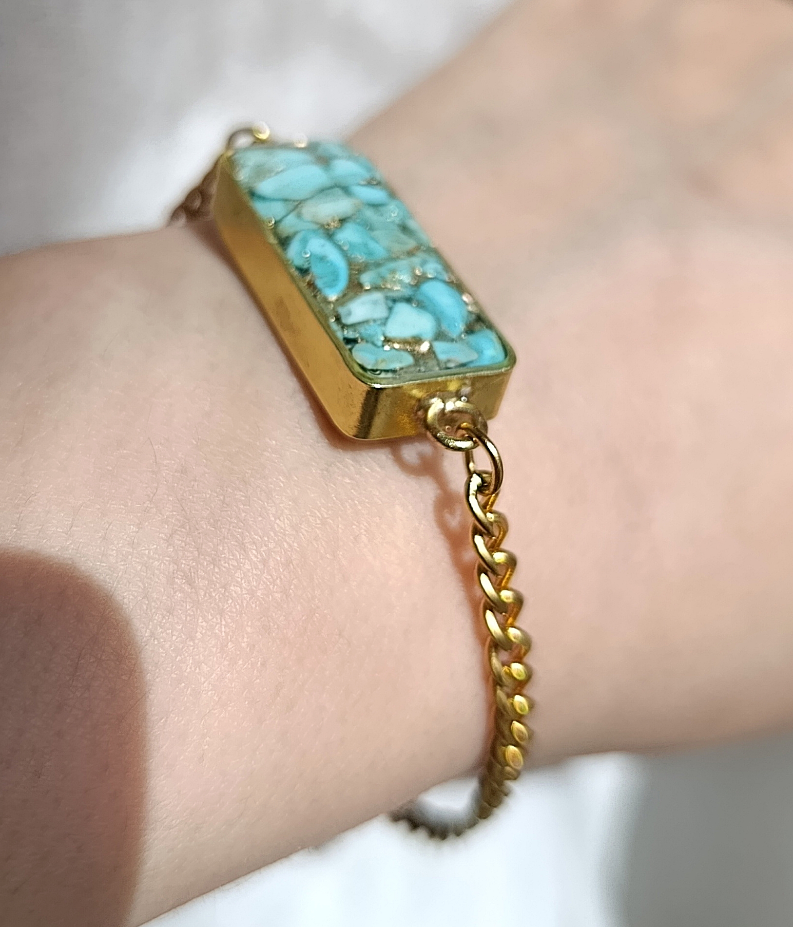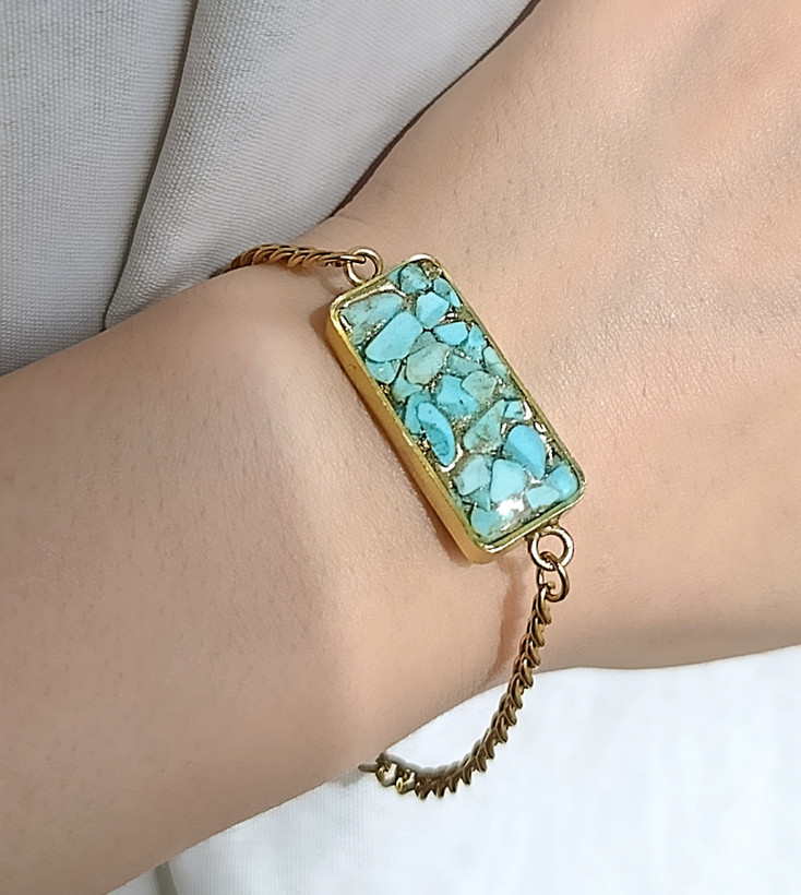 دستبند کارتیر استیل طلایی زنانه سنگ فیروزه طرح مستطیل خرید قسطی
