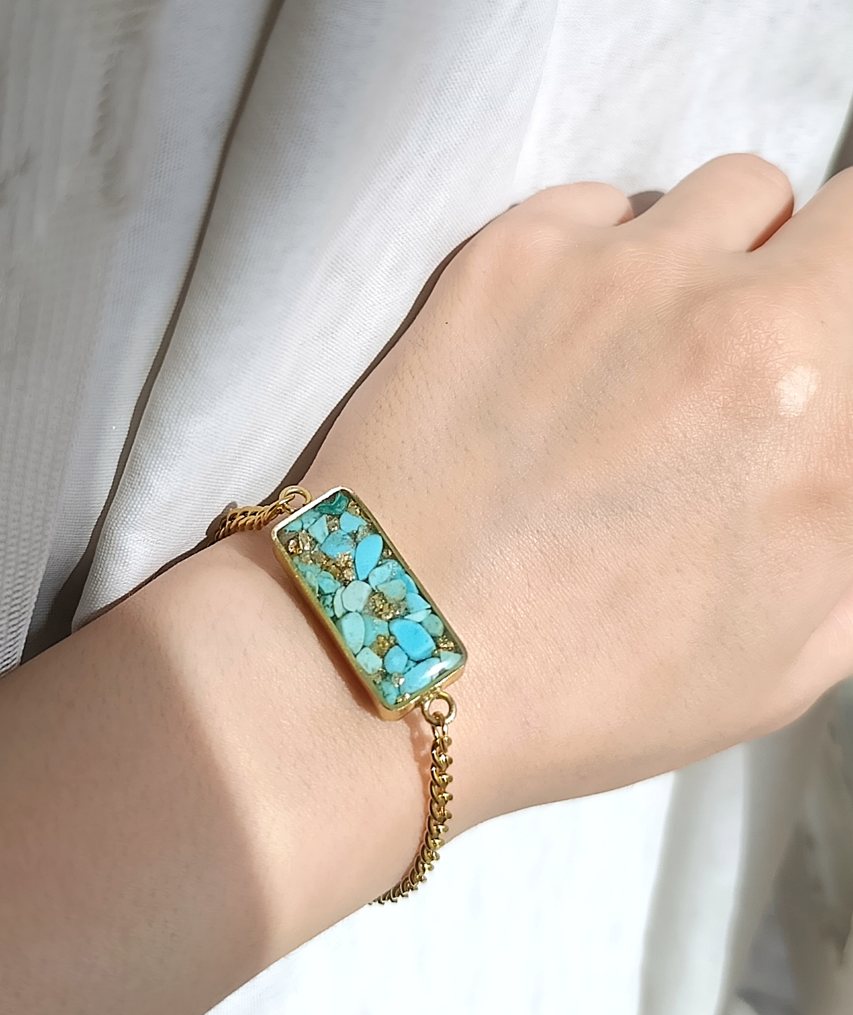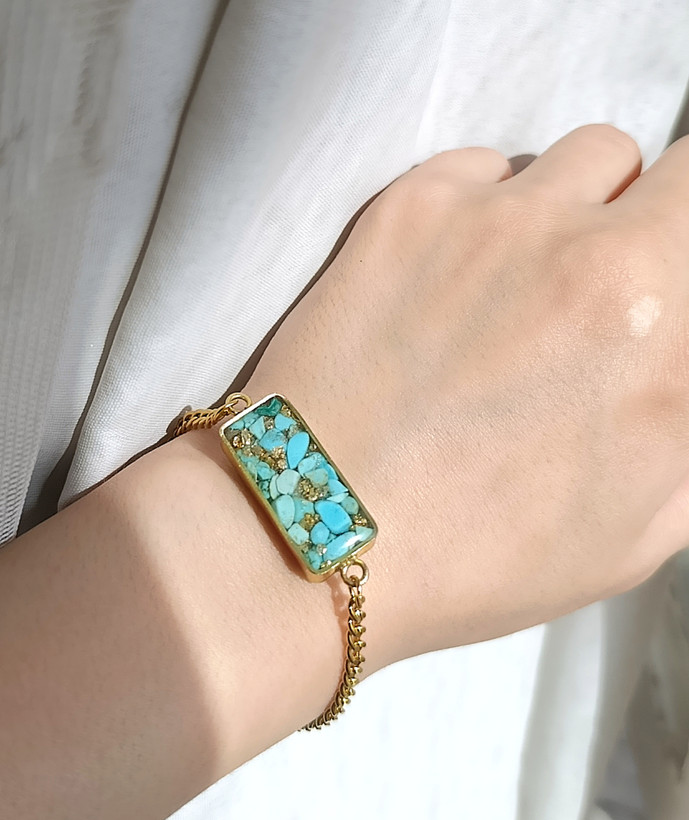 زیو آلات خاص فروشگاه عجم استور با خردهسنگهای فیروزه تبتی یا آفریقایی ساخته شده و با رزین شفاف فیکس شده تا جلوهای درخشان و ماندگار داشته باشد.