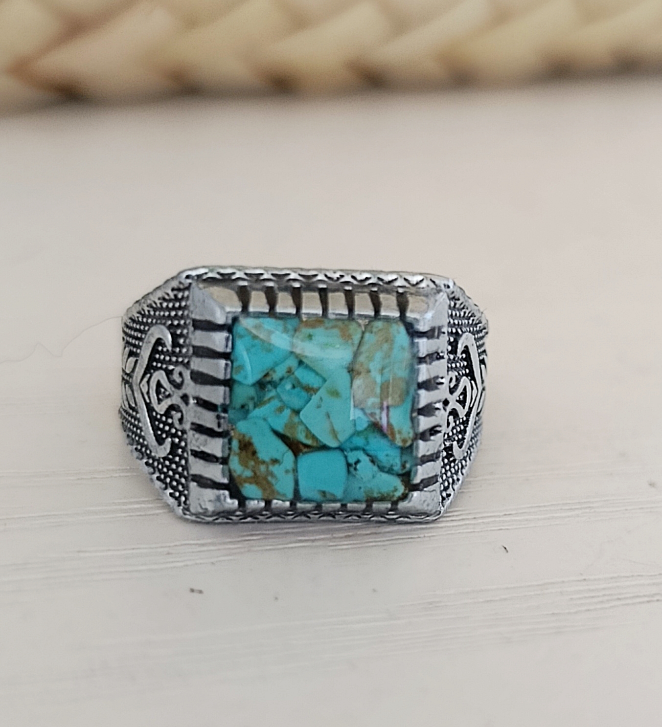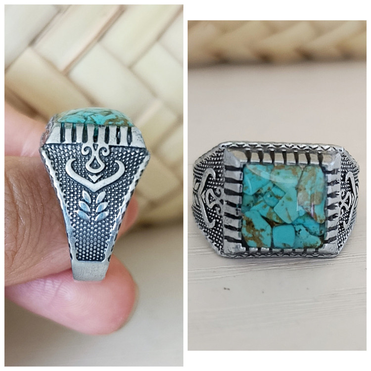 فیروزه به کار رفته در انگشتر های سایت عجم استور فیروزه های شکسته معدنی تبتی یا آفریقایی میباشد که با رزین کنار هم قرار گرفته شده است