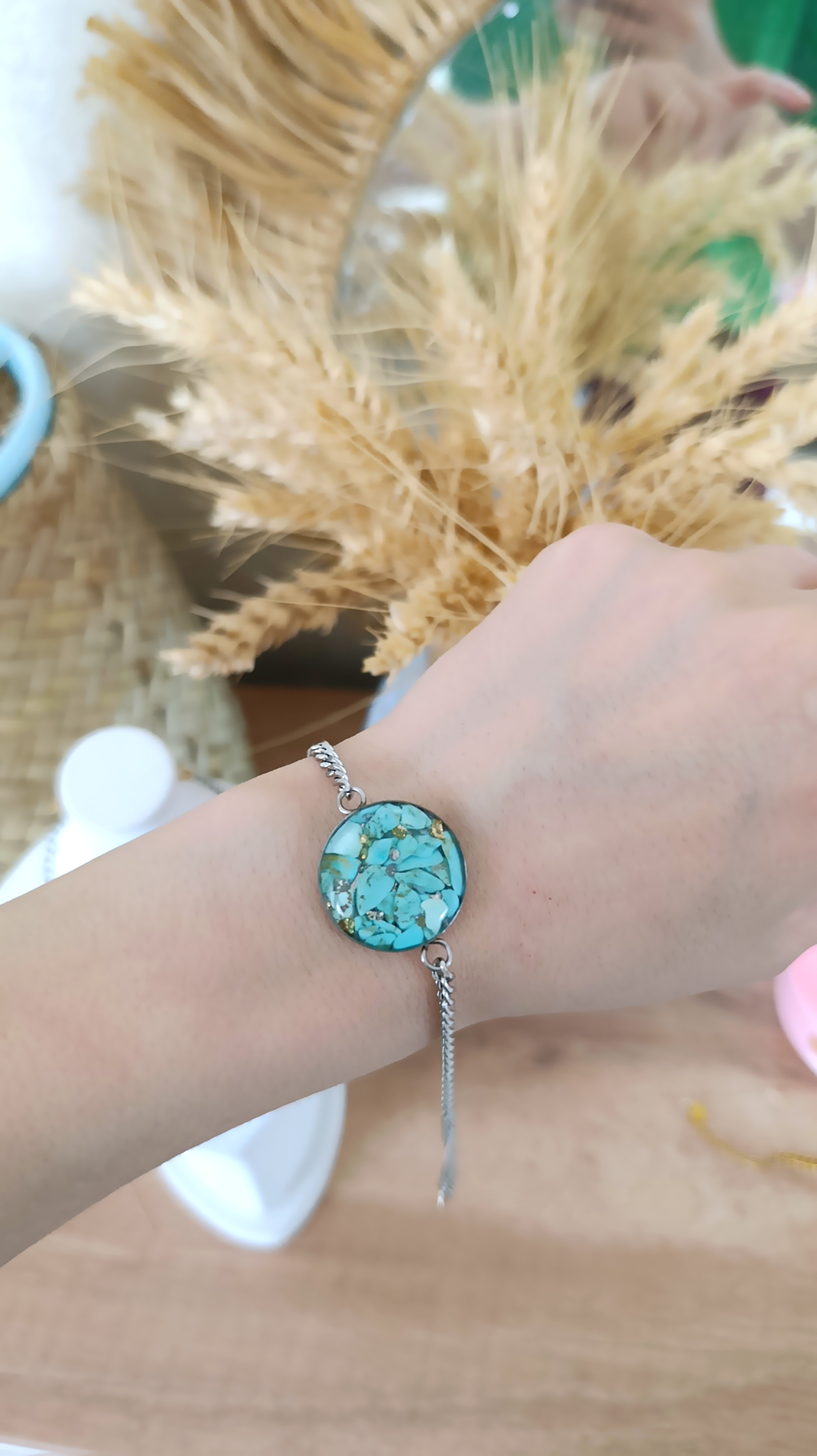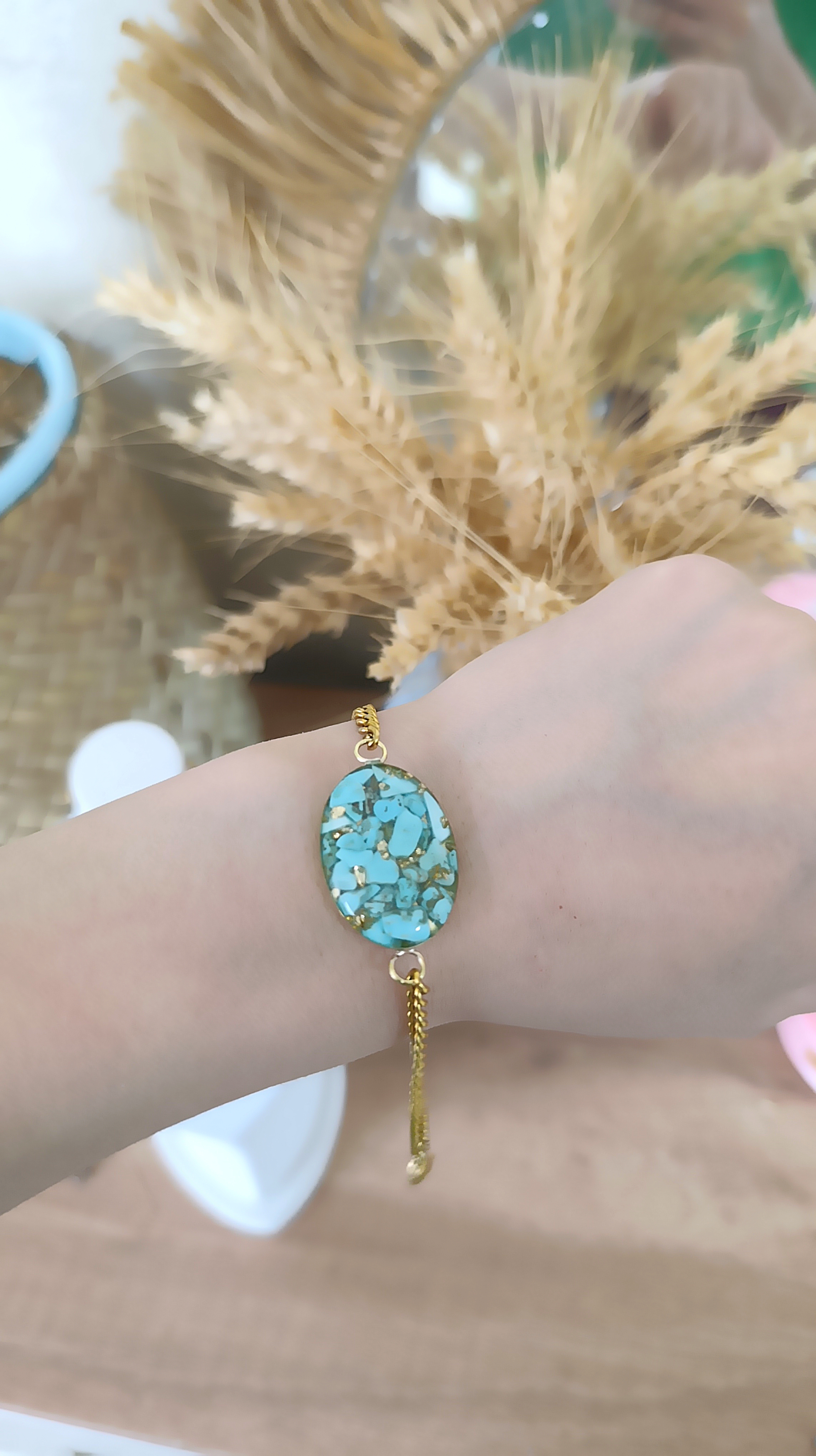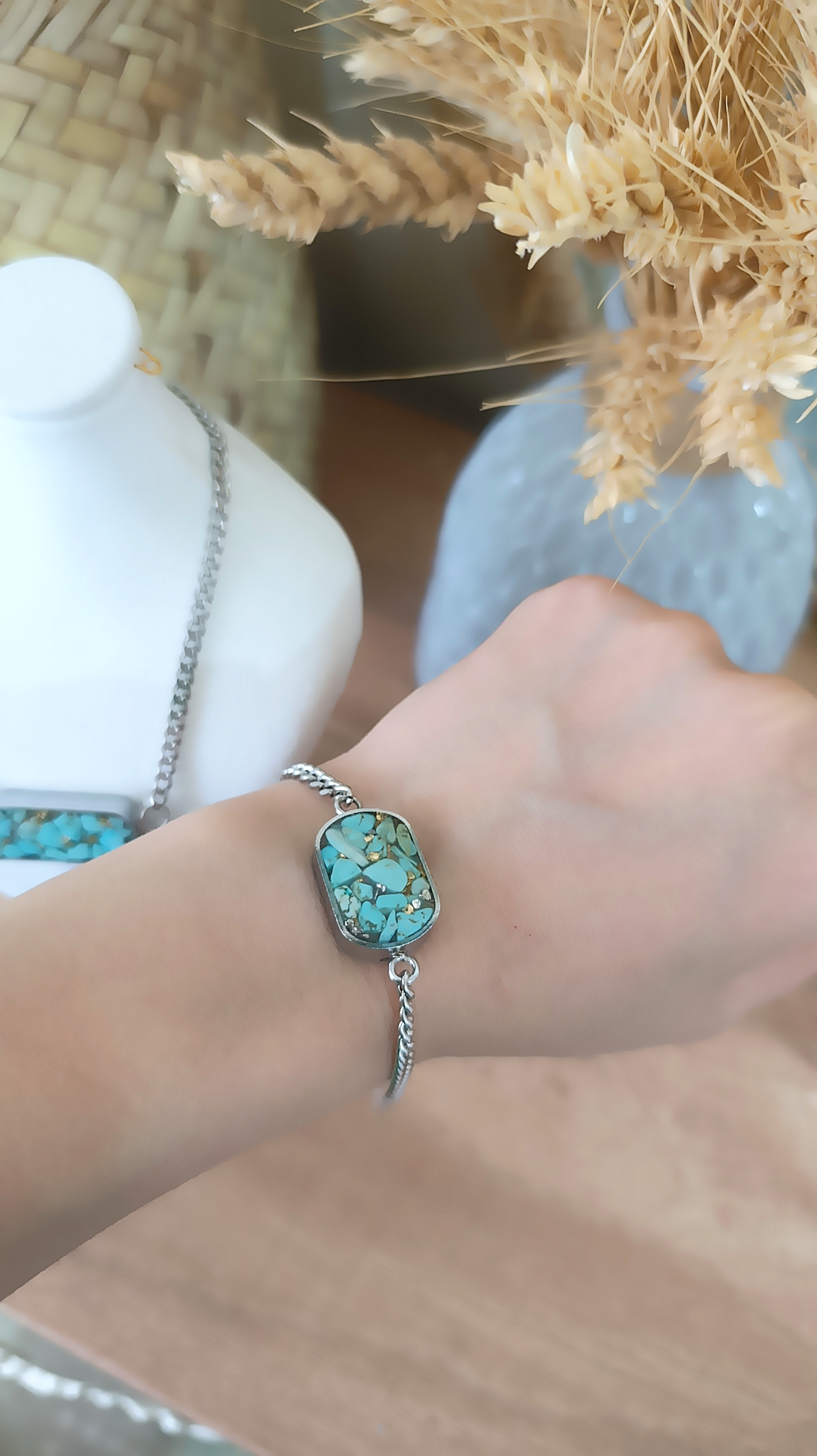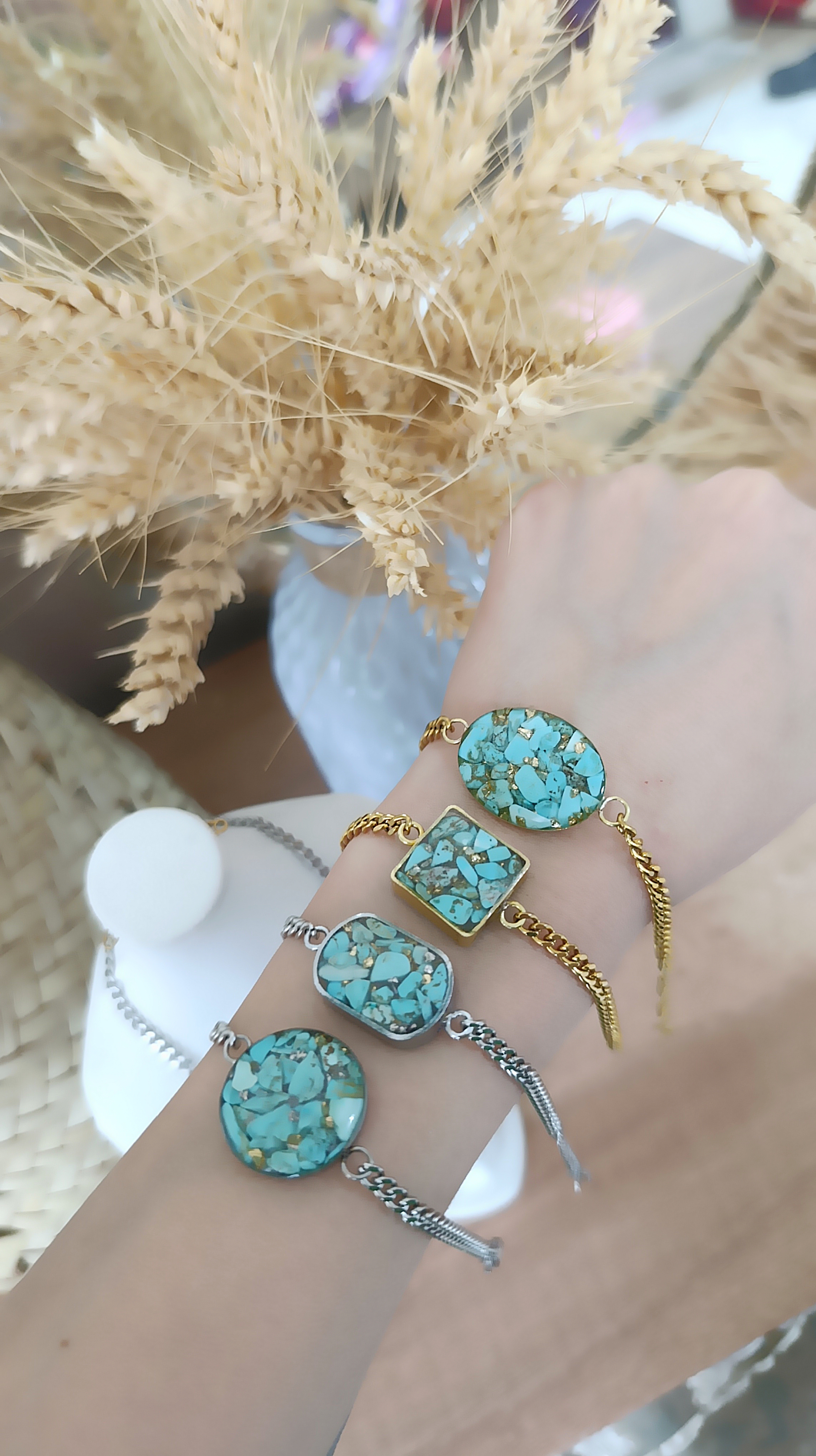 زیو آلات خاص فروشگاه عجم استور با خردهسنگهای فیروزه تبتی یا آفریقایی ساخته شده و با رزین شفاف فیکس شده تا جلوهای درخشان و ماندگار داشته باشد.