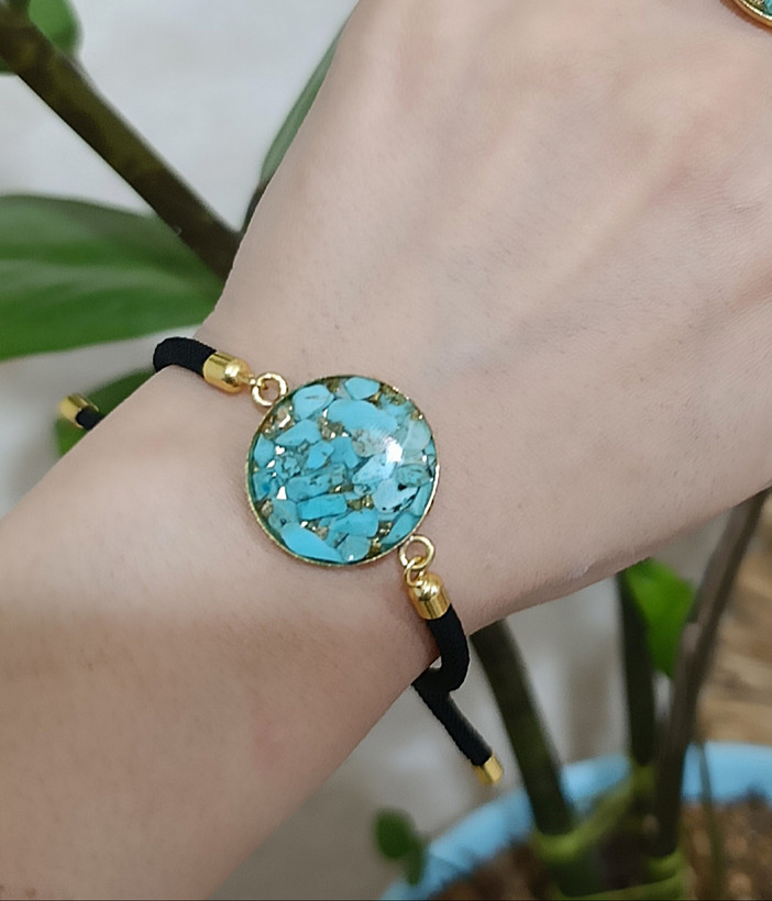 زیو آلات خاص فروشگاه عجم استور با خردهسنگهای فیروزه تبتی یا آفریقایی ساخته شده و با رزین شفاف فیکس شده تا جلوهای درخشان و ماندگار داشته باشد.
