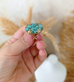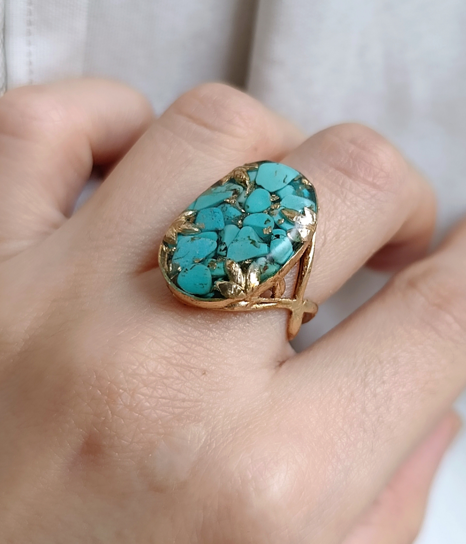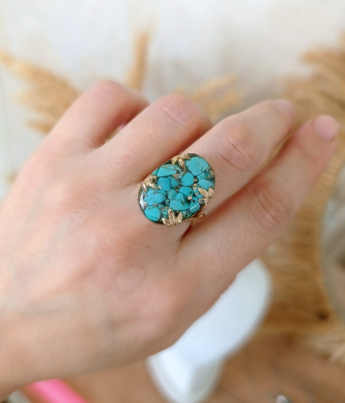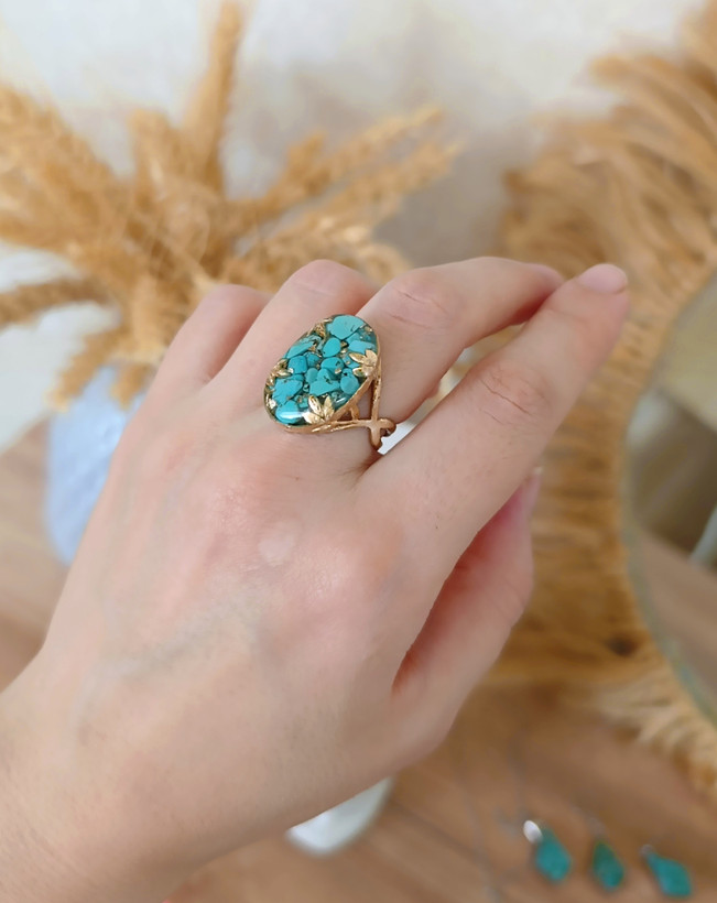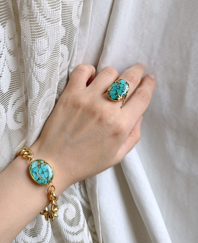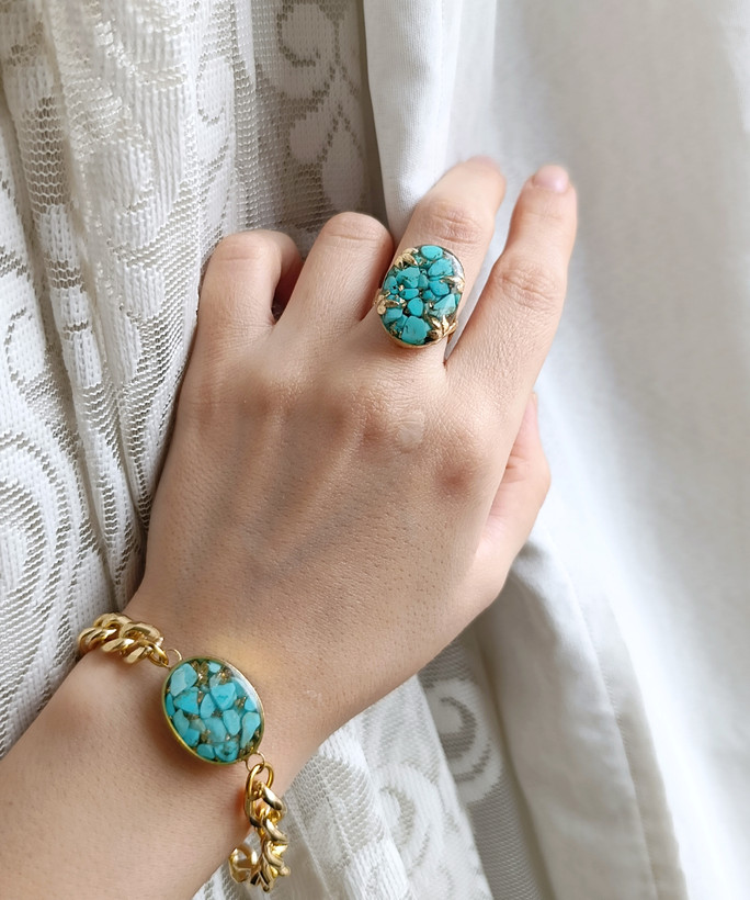 زیو آلات خاص فروشگاه عجم استور با خردهسنگهای فیروزه تبتی یا آفریقایی ساخته شده و با رزین شفاف فیکس شده تا جلوهای درخشان و ماندگار داشته باشد.