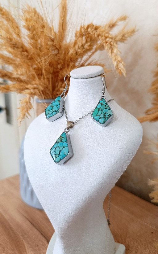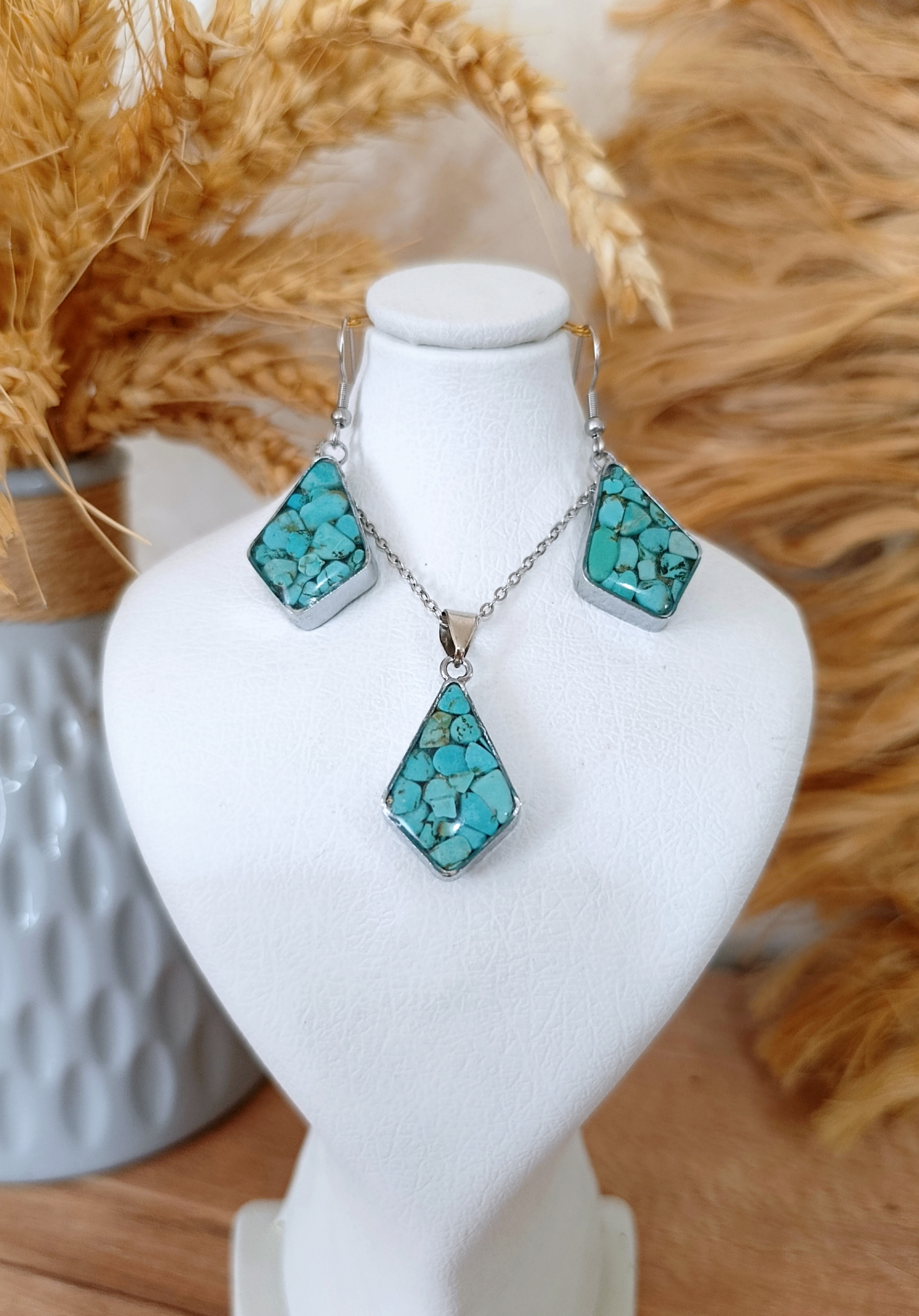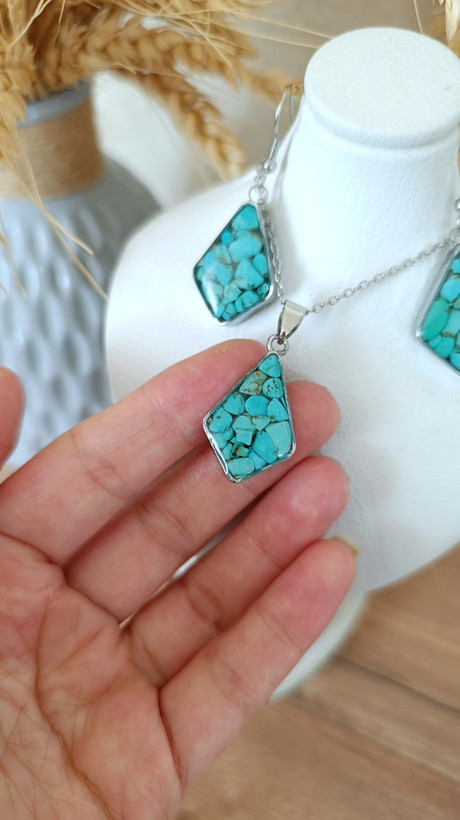 زیو آلات خاص فروشگاه عجم استور با خردهسنگهای فیروزه تبتی یا آفریقایی ساخته شده و با رزین شفاف فیکس شده تا جلوهای درخشان و ماندگار داشته باشد.