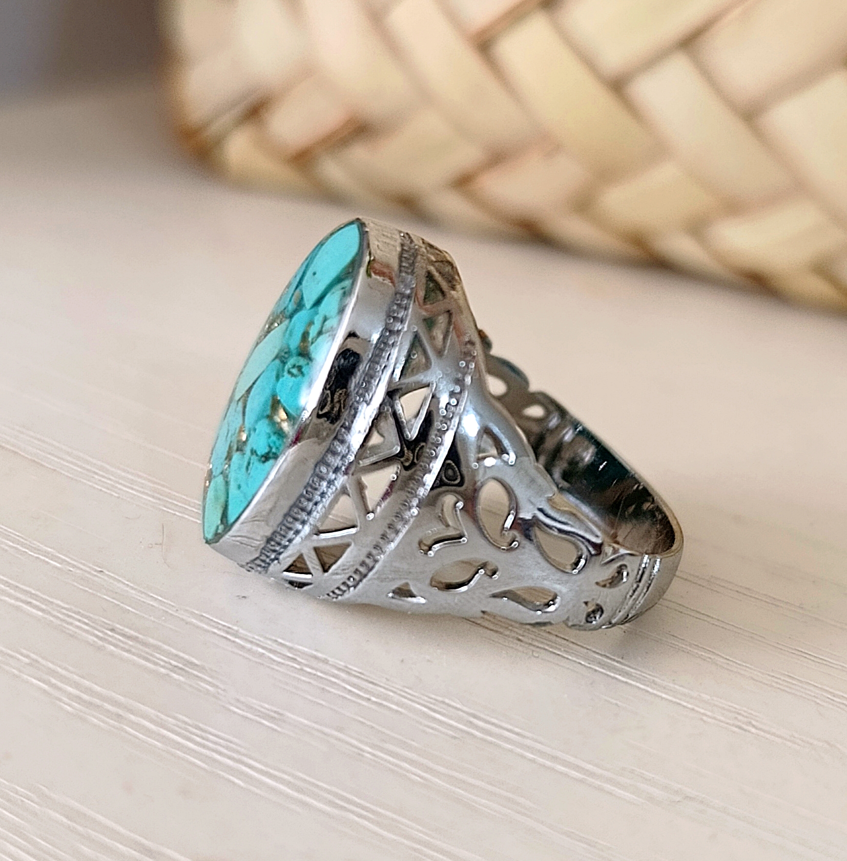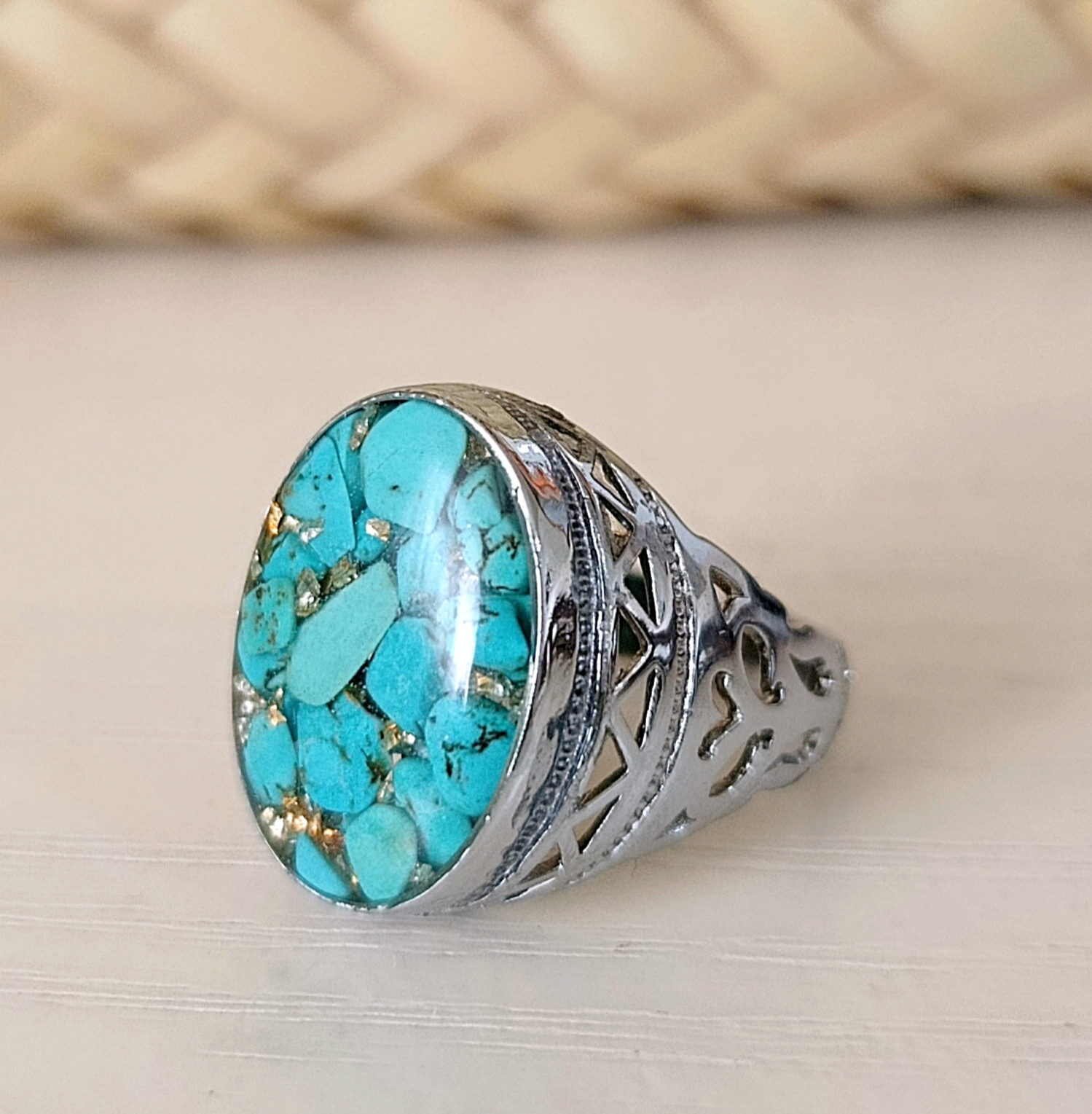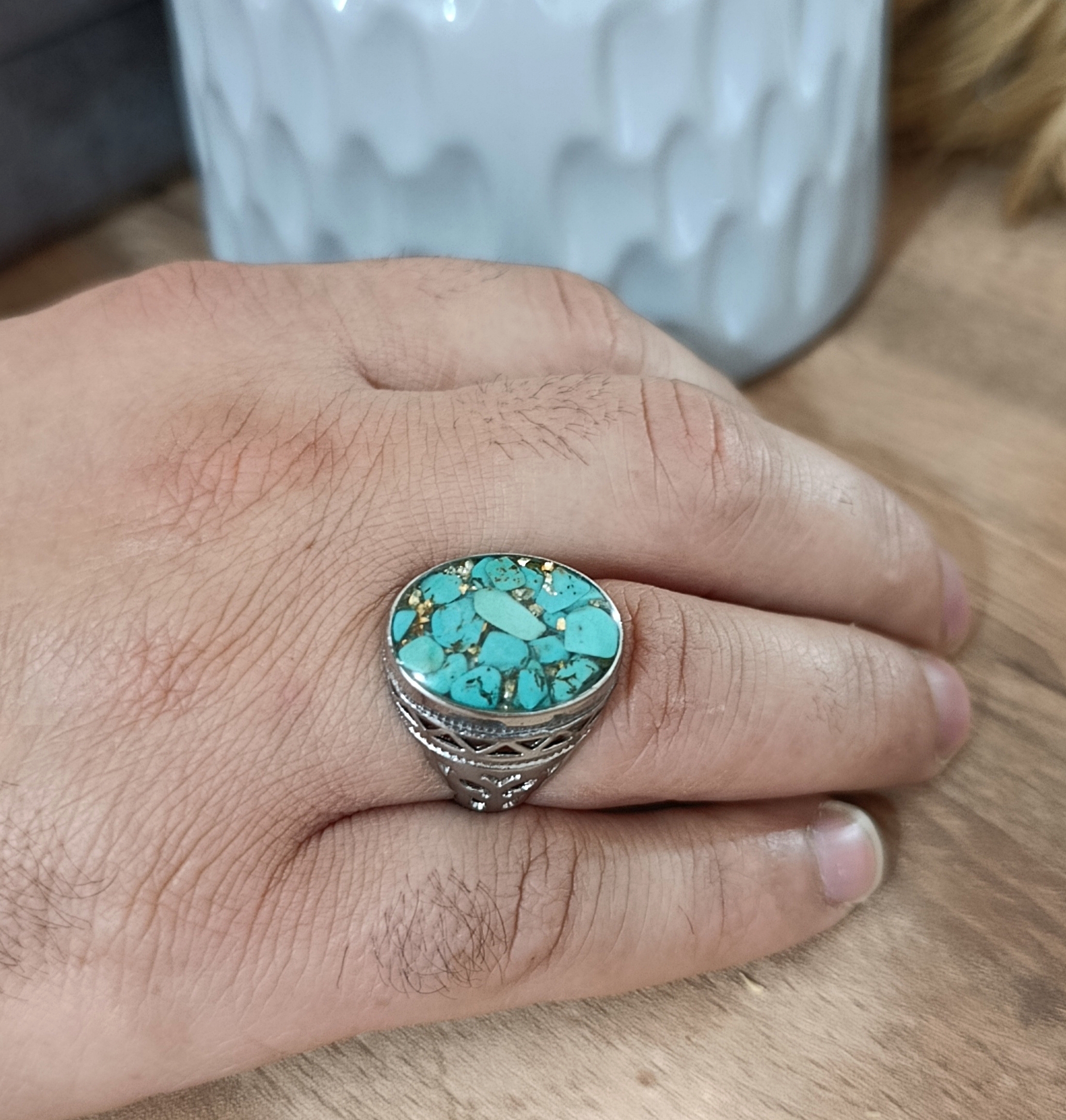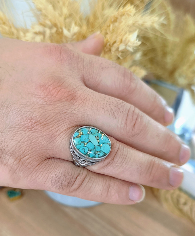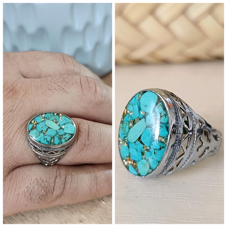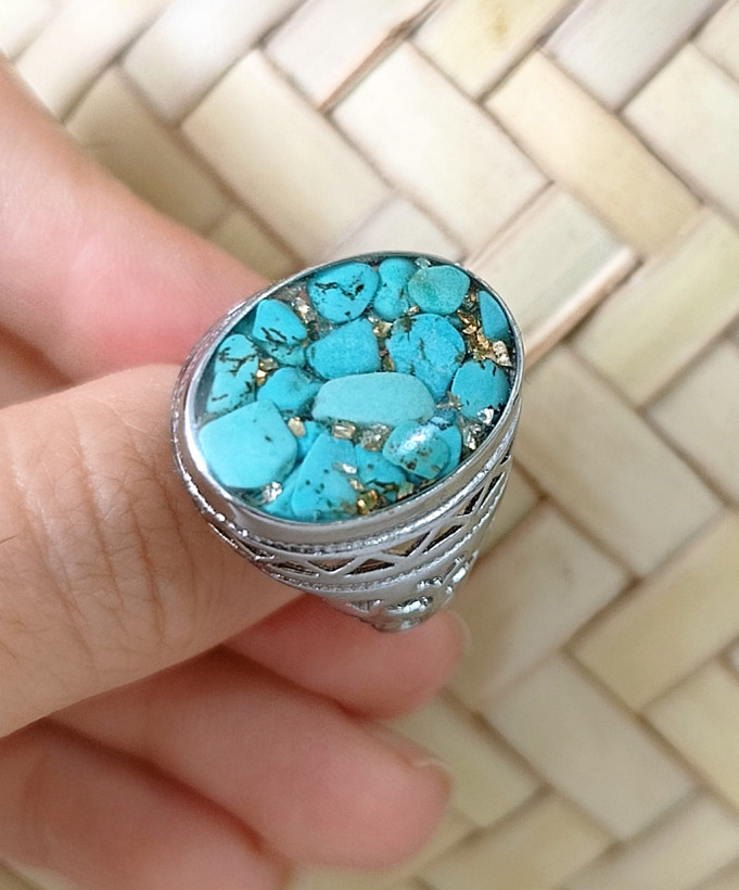 زیو آلات خاص فروشگاه عجم استور با خردهسنگهای فیروزه تبتی یا آفریقایی ساخته شده و با رزین شفاف فیکس شده تا جلوهای درخشان و ماندگار داشته باشد.