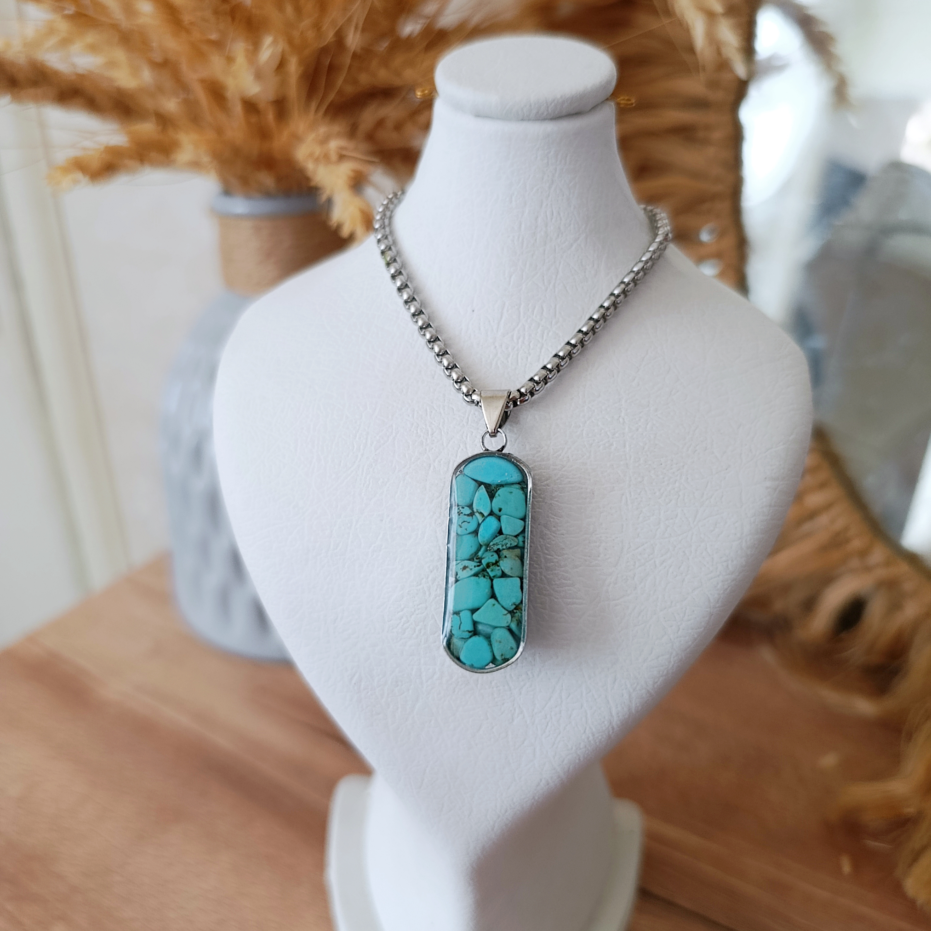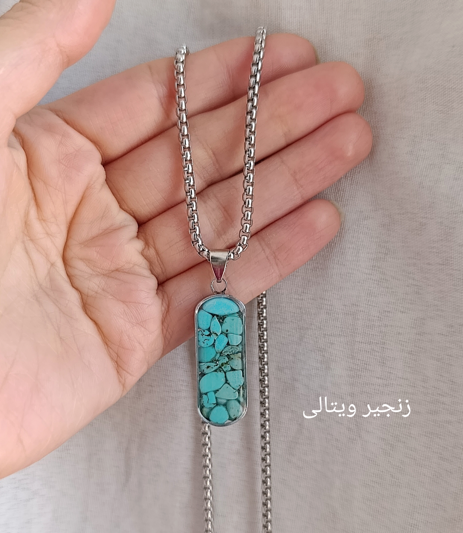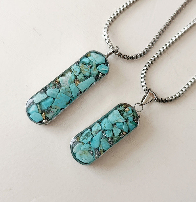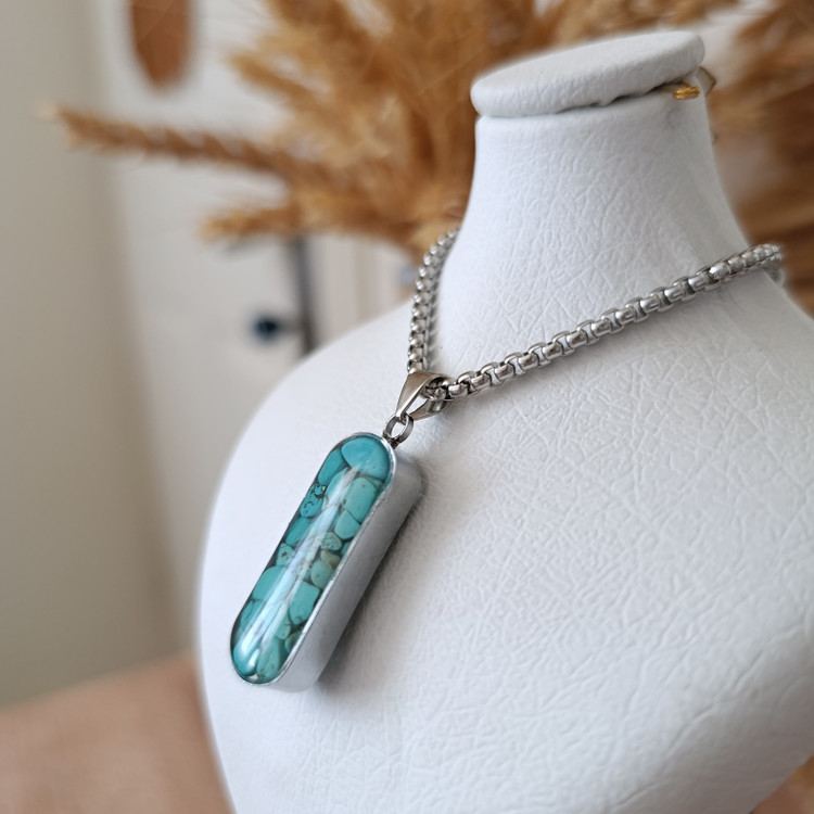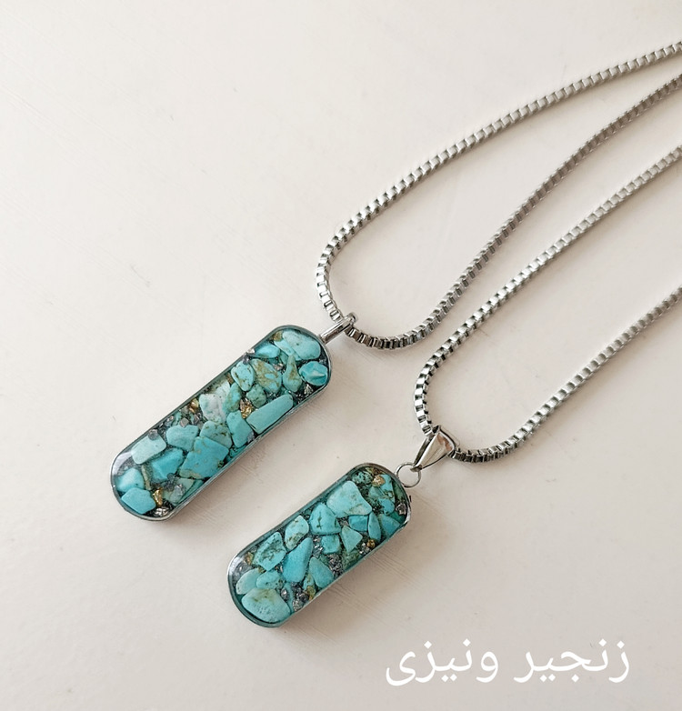 زیو آلات خاص فروشگاه عجم استور با خردهسنگهای فیروزه تبتی یا آفریقایی ساخته شده و با رزین شفاف فیکس شده تا جلوهای درخشان و ماندگار داشته باشد.