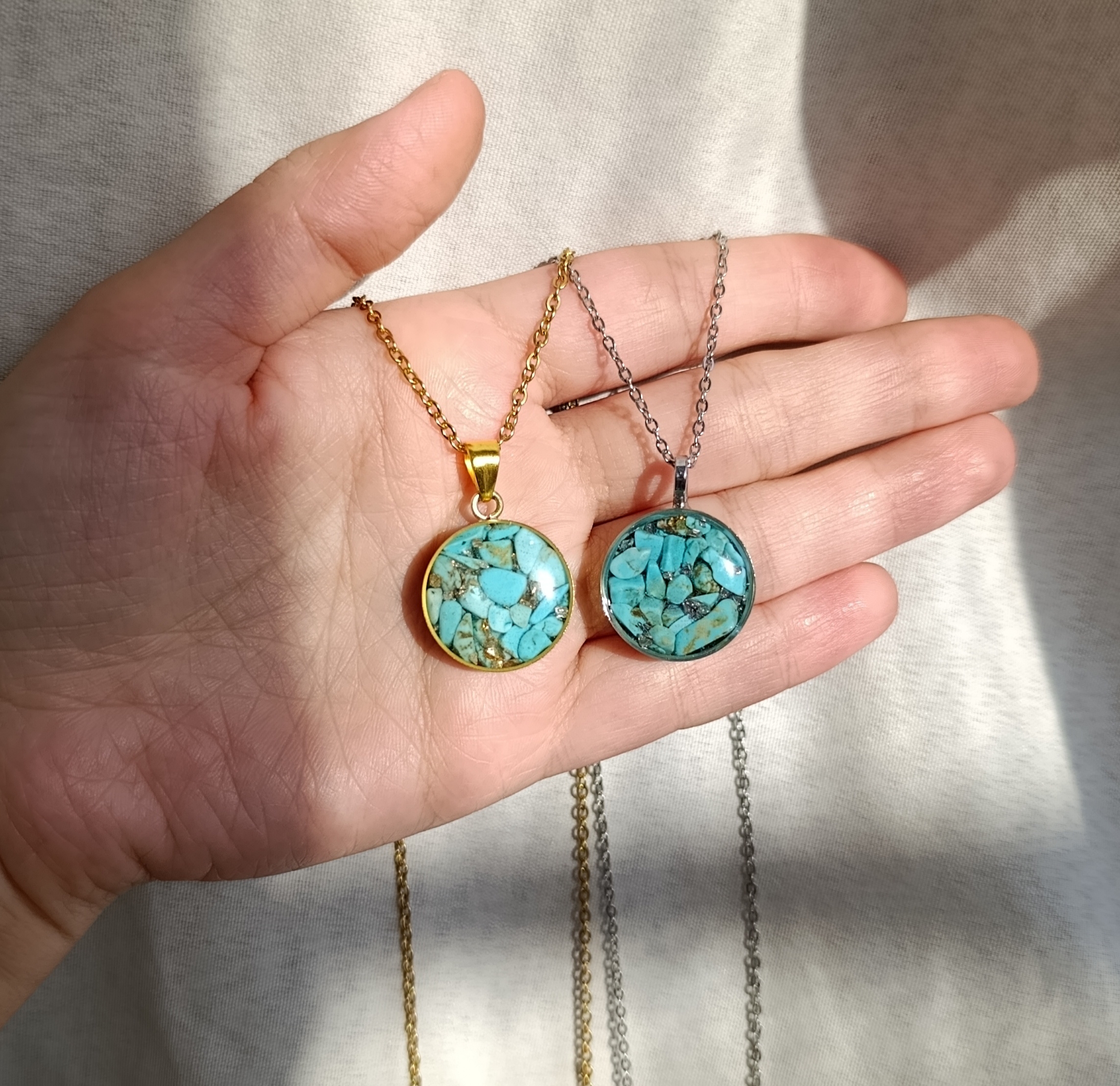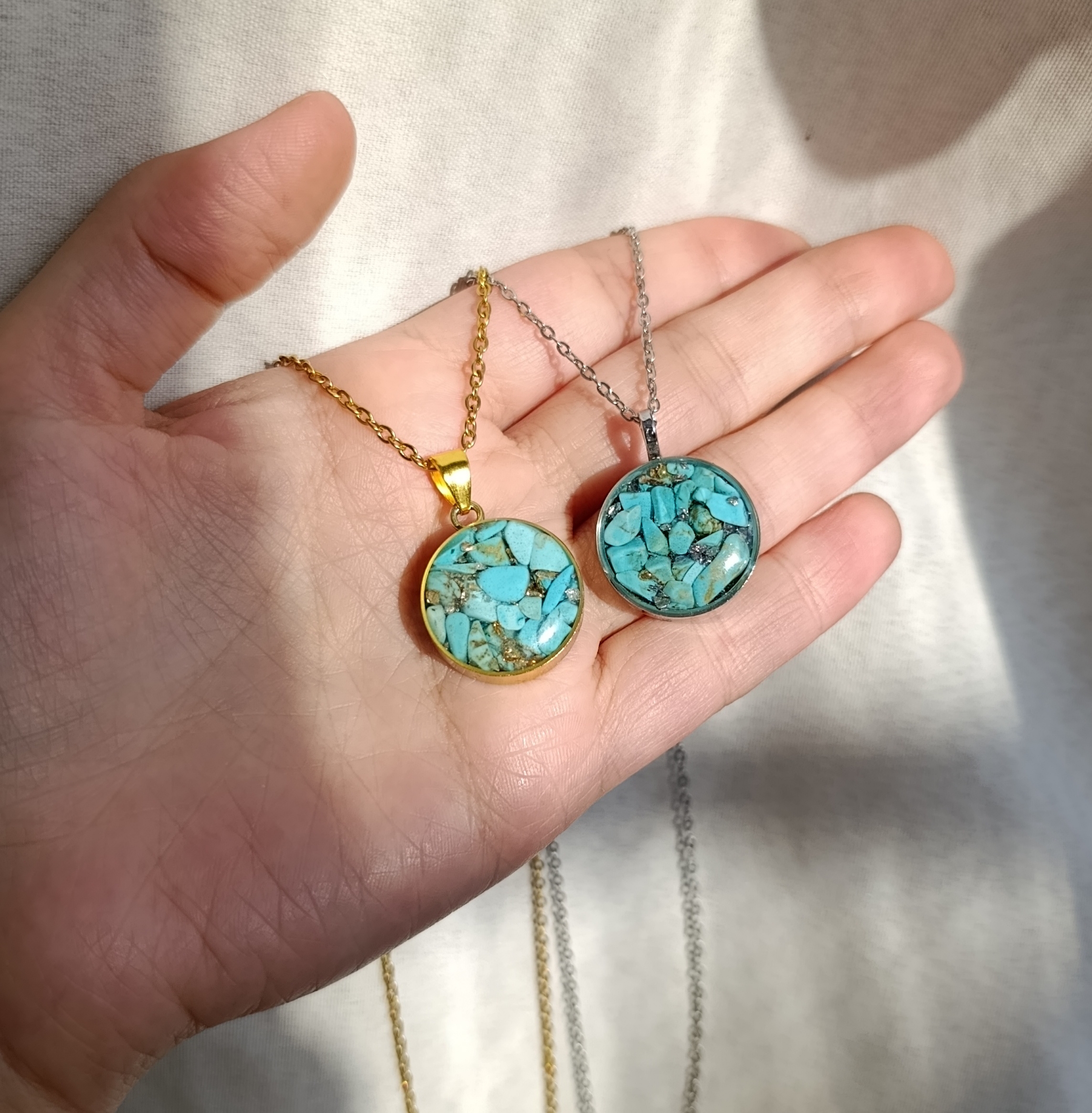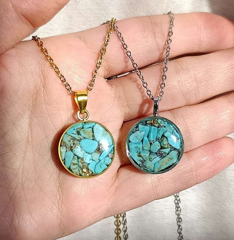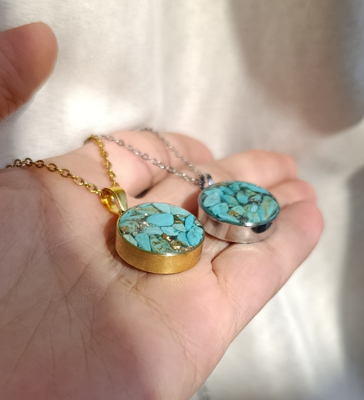 زیو آلات خاص فروشگاه عجم استور با خردهسنگهای فیروزه تبتی یا آفریقایی ساخته شده و با رزین شفاف فیکس شده تا جلوهای درخشان و ماندگار داشته باشد.