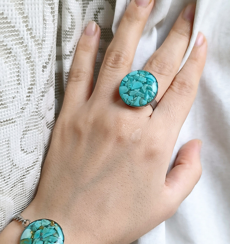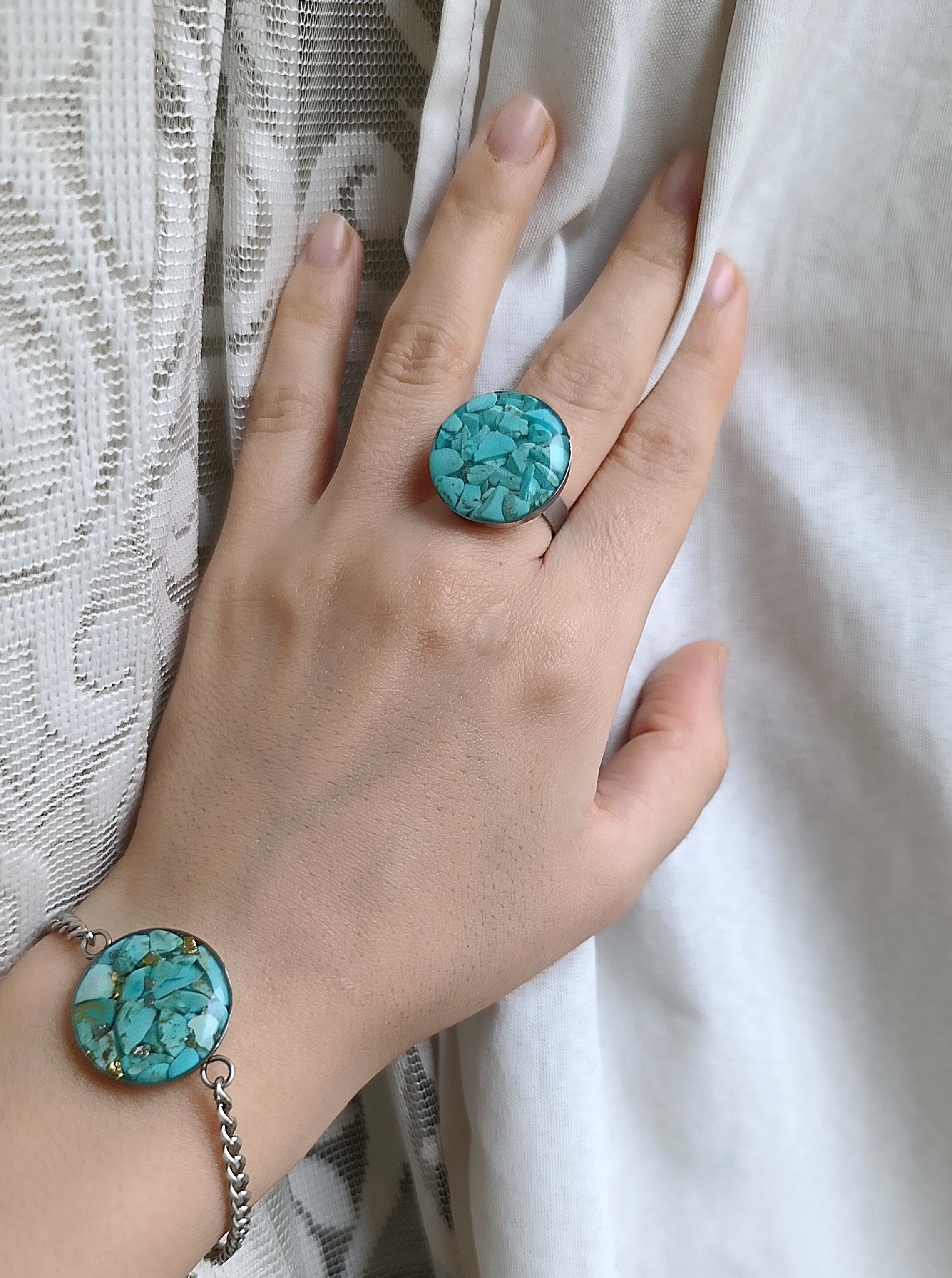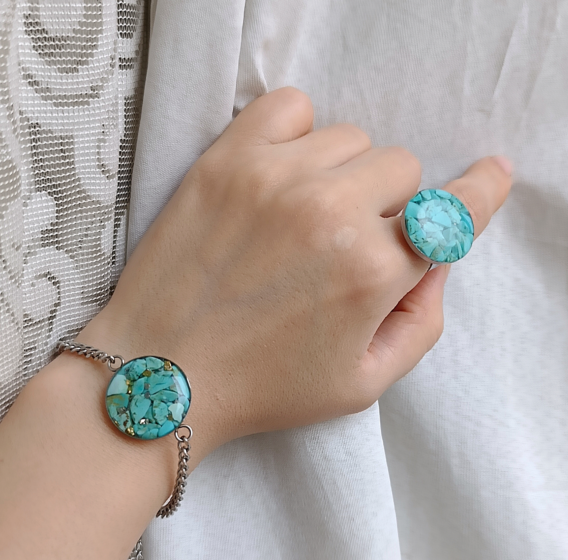زیو آلات خاص فروشگاه عجم استور با خردهسنگهای فیروزه تبتی یا آفریقایی ساخته شده و با رزین شفاف فیکس شده تا جلوهای درخشان و ماندگار داشته باشد.