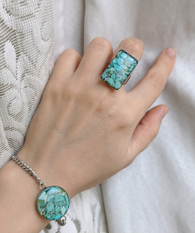 زیو آلات خاص فروشگاه عجم استور با خردهسنگهای فیروزه تبتی یا آفریقایی ساخته شده و با رزین شفاف فیکس شده تا جلوهای درخشان و ماندگار داشته باشد.