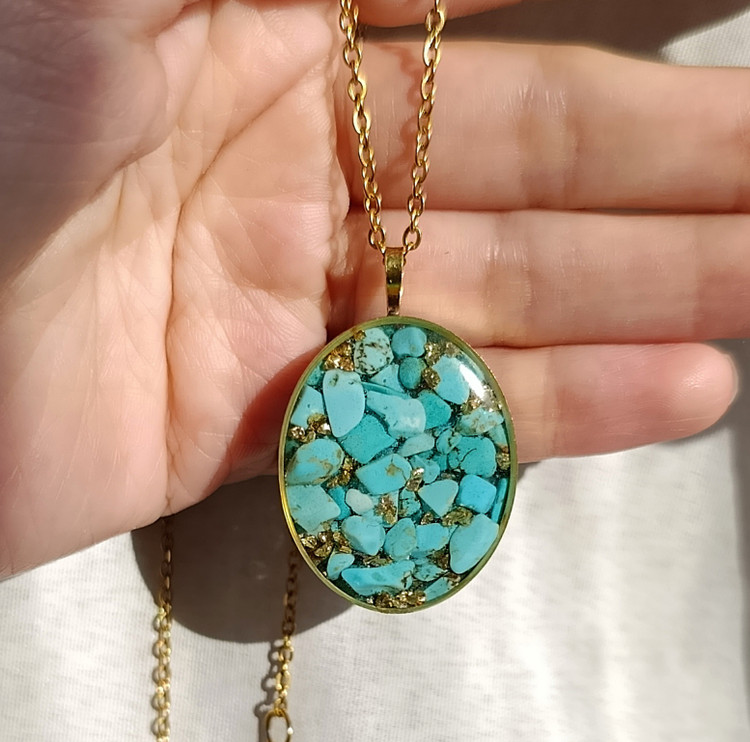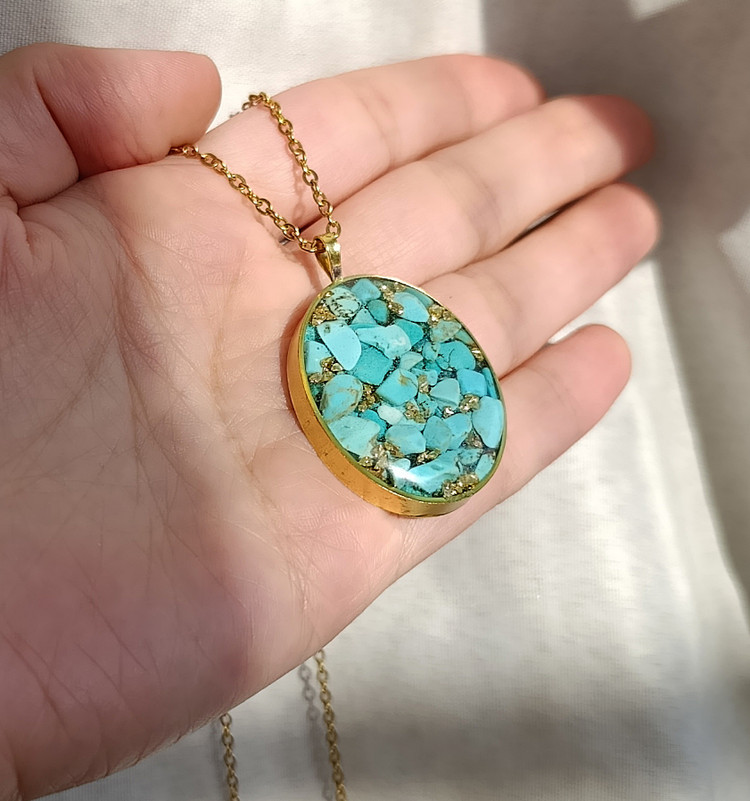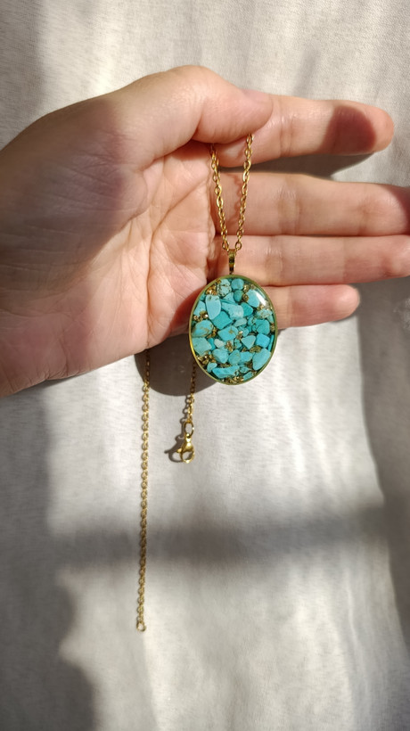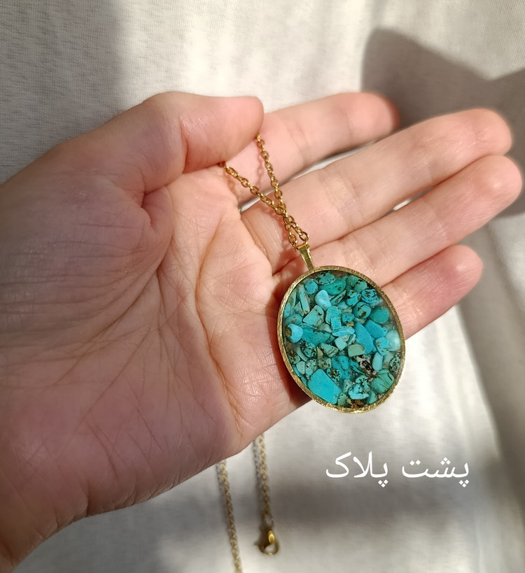 زیو آلات خاص فروشگاه عجم استور با خردهسنگهای فیروزه تبتی یا آفریقایی ساخته شده و با رزین شفاف فیکس شده تا جلوهای درخشان و ماندگار داشته باشد.