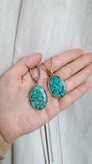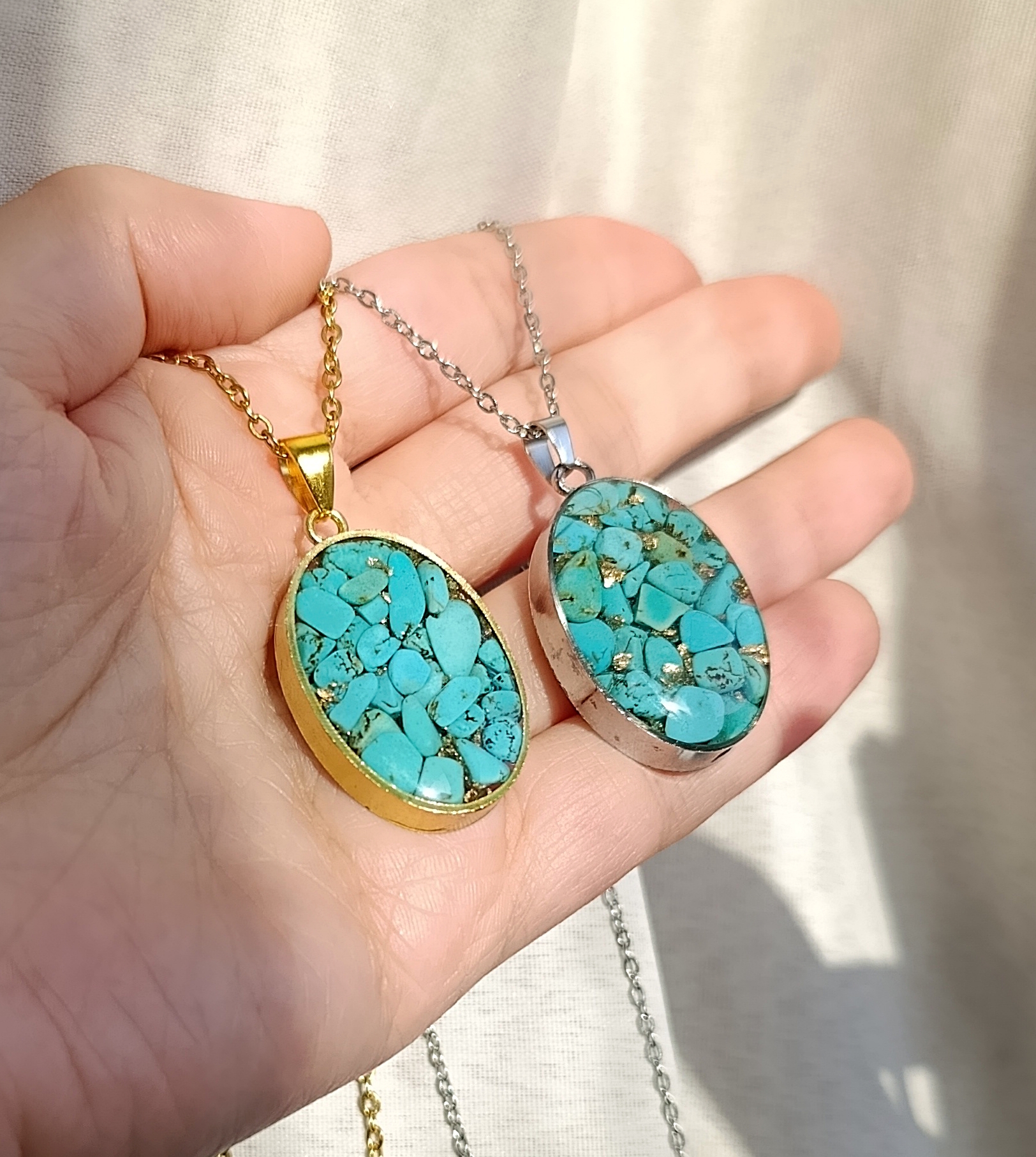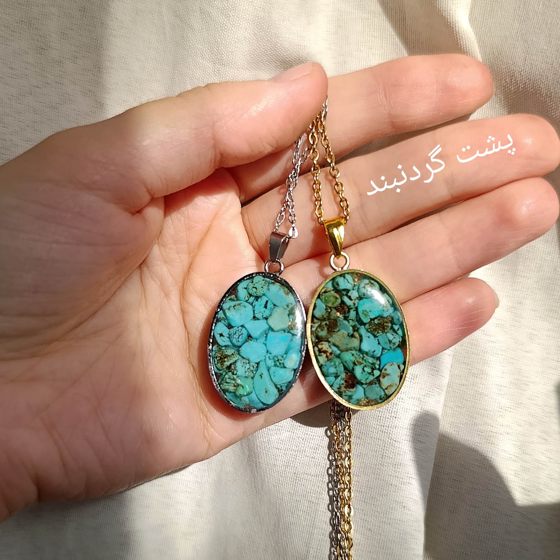 زیو آلات خاص فروشگاه عجم استور با خردهسنگهای فیروزه تبتی یا آفریقایی ساخته شده و با رزین شفاف فیکس شده تا جلوهای درخشان و ماندگار داشته باشد.