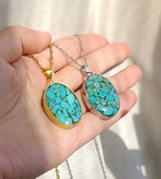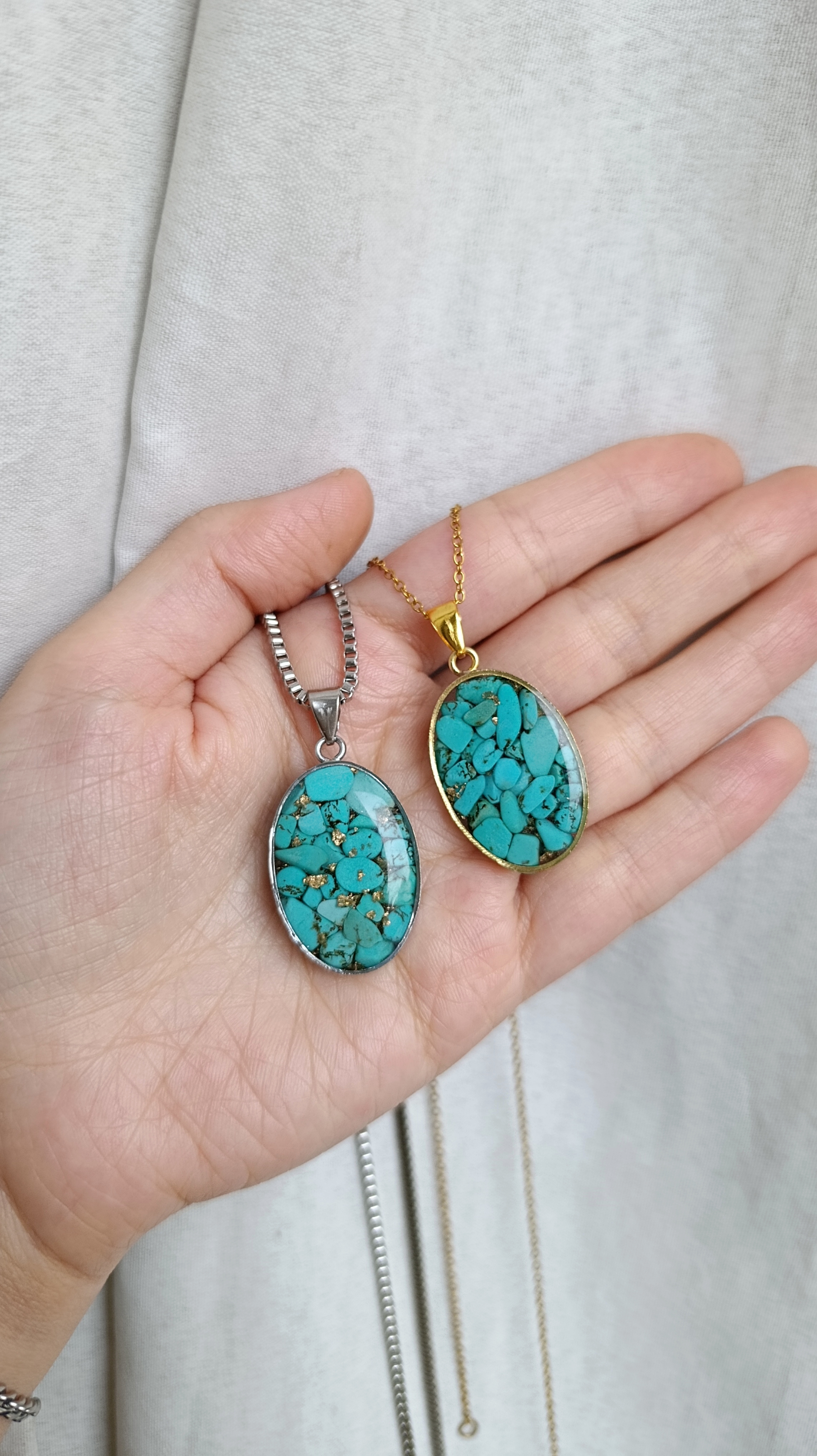 گردنبند طلایی فیروزه طرح بیضی متوسط با زنجیر استیل دیپلمات