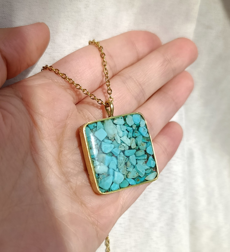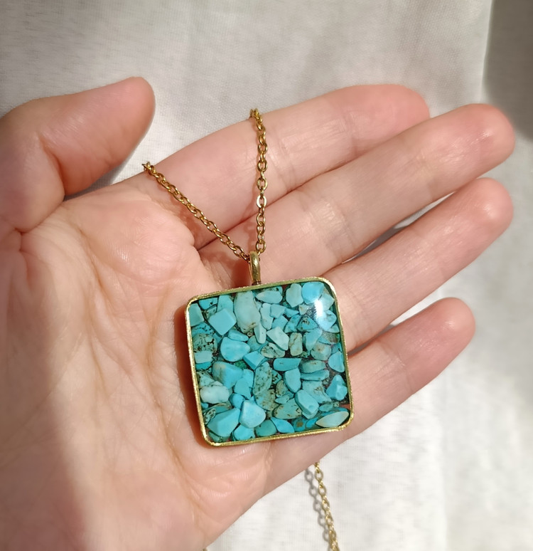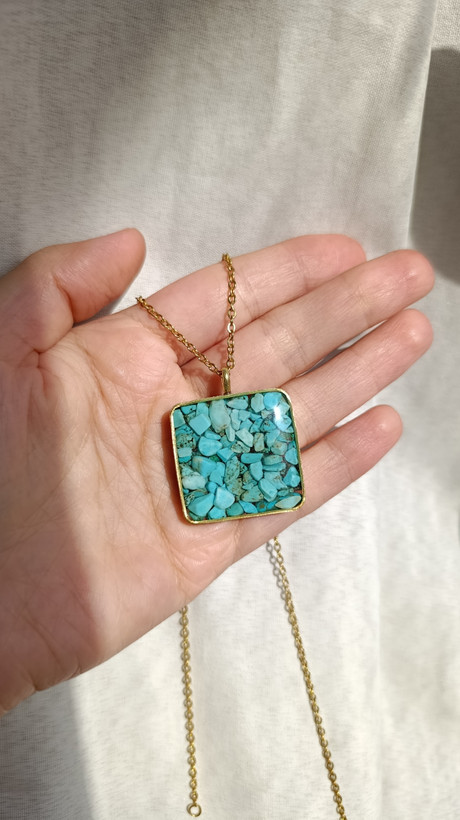 زیو آلات خاص فروشگاه عجم استور با خردهسنگهای فیروزه تبتی یا آفریقایی ساخته شده و با رزین شفاف فیکس شده تا جلوهای درخشان و ماندگار داشته باشد.