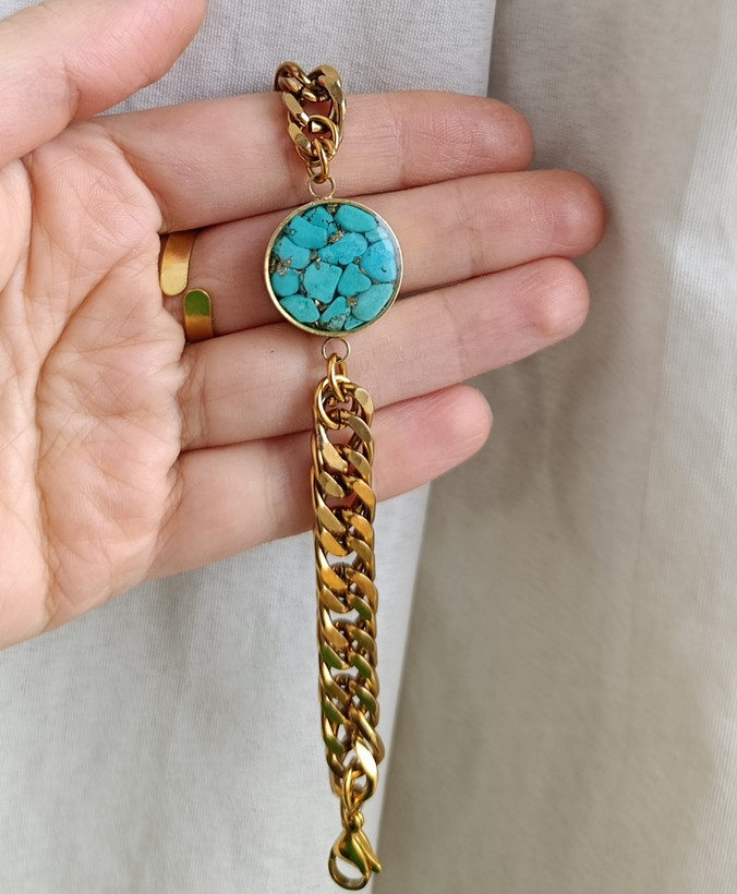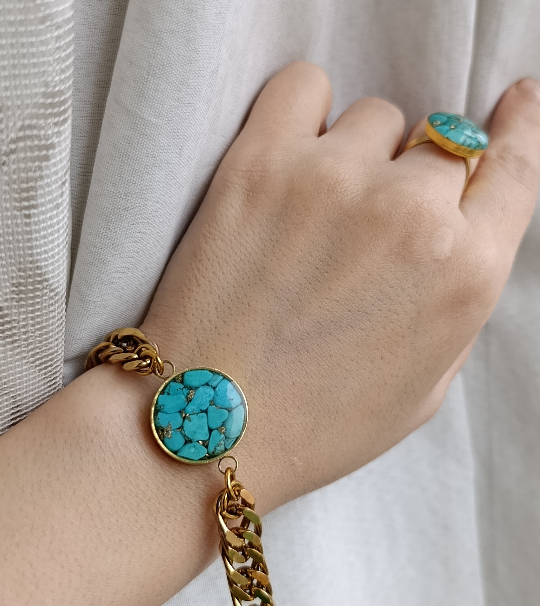 زیو آلات خاص فروشگاه عجم استور با خردهسنگهای فیروزه تبتی یا آفریقایی ساخته شده و با رزین شفاف فیکس شده تا جلوهای درخشان و ماندگار داشته باشد.