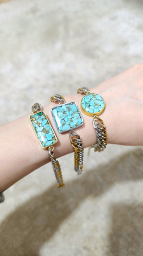 دستبند کارتیر استیل دو رنگ زنانه سنگ فیروزه طرح مستطیل خرید قسطی
