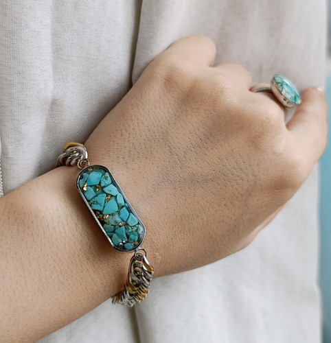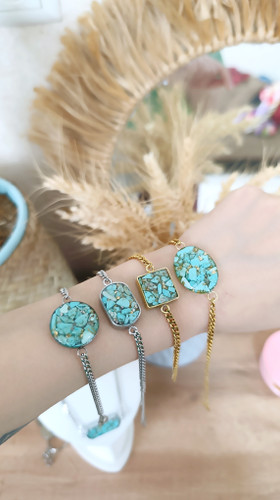 دستبند ونکلیف زنانه سنگ فیروزه با زنجیر طلایی استیل کارتیر ظریف