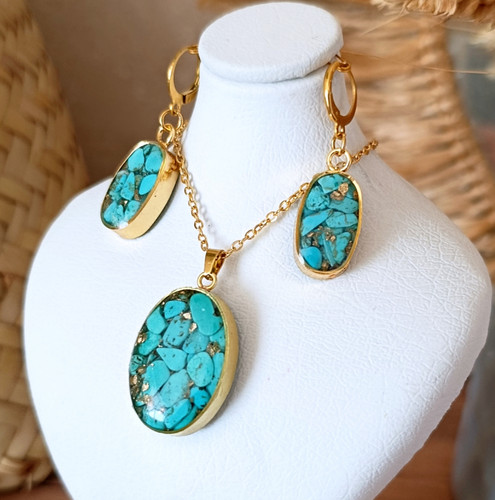 نیم ست زیورآلات گردنبند و گوشواره بیضی سنگ فیروزه