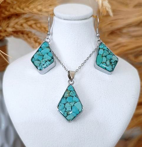 نیم ست گردنبند و گوشواره فیروزه طرح لوزی فریم استیل