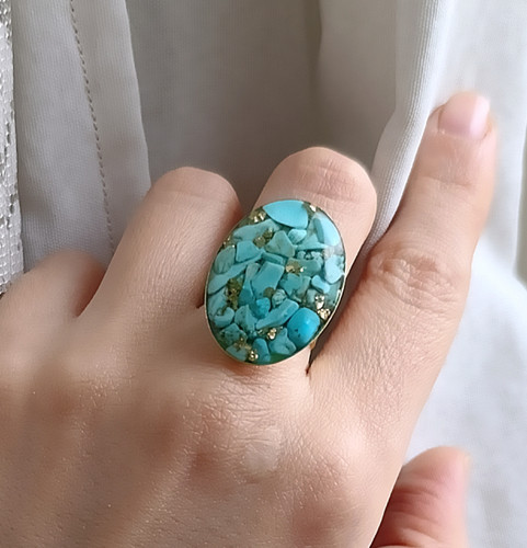 انگشتر زنانه سنگ فیروزه رکاب برنجی طلایی طرح بیضی بزرگ