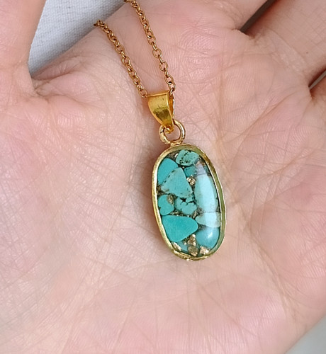 گردنبند طلایی فیروزه طرح بیضی سایز بزرگ با زنجیر استیل دیپلمات