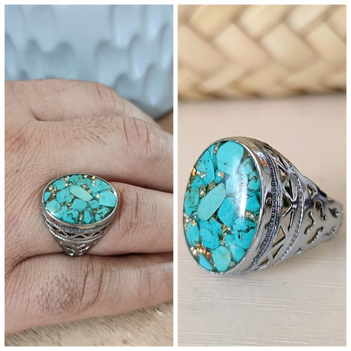 انگشتر زنانه سنگ فیروزه رکاب استیل نقره ای طرح بیضی کوچک