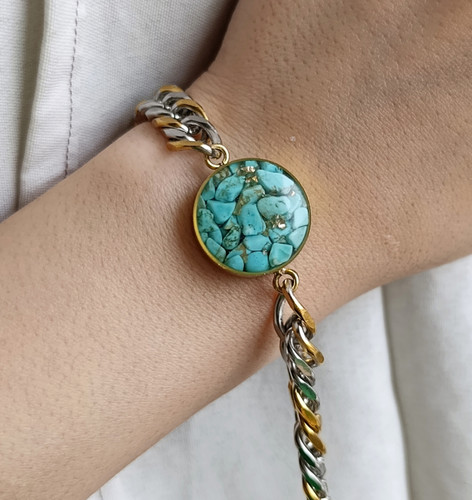 دستبند کارتیر استیل دو رنگ زنانه سنگ فیروزه طرح دایره خرید قسطی