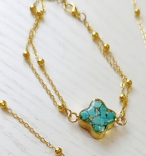 دستبند زنانه ونکلیف سنگ فیروزه با زنجیر برنجی طلایی خلخال توپی