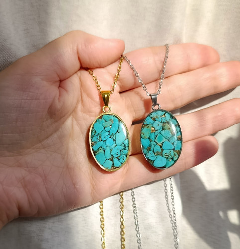 گردنبند طلایی فیروزه طرح بیضی متوسط با زنجیر استیل دیپلمات