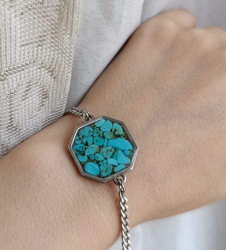دستبند فیروزه با زنجیر استیل کارتیر ظریف زنانه نقره ای طرح هشت ضلعی