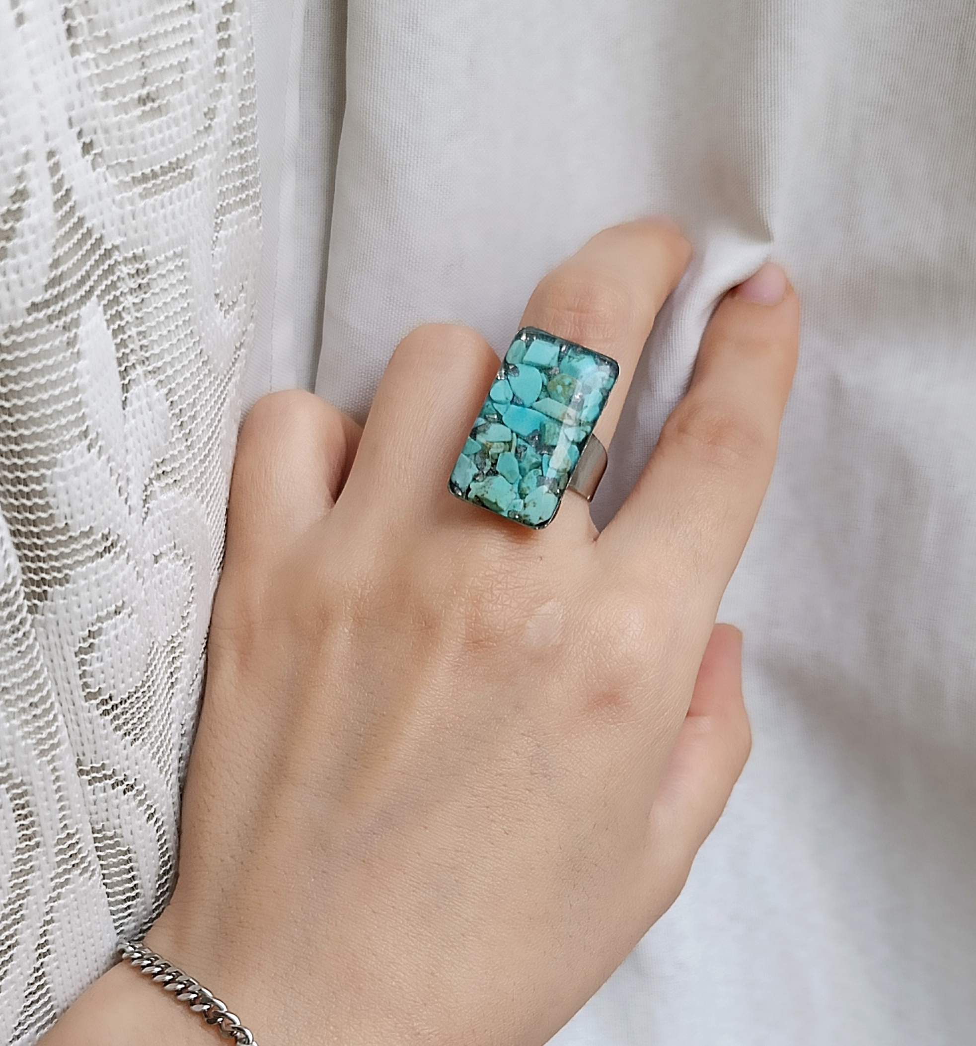 انگشتر زنانه سنگ فیروزه رکاب استیل نقره ای طرح مستطیل