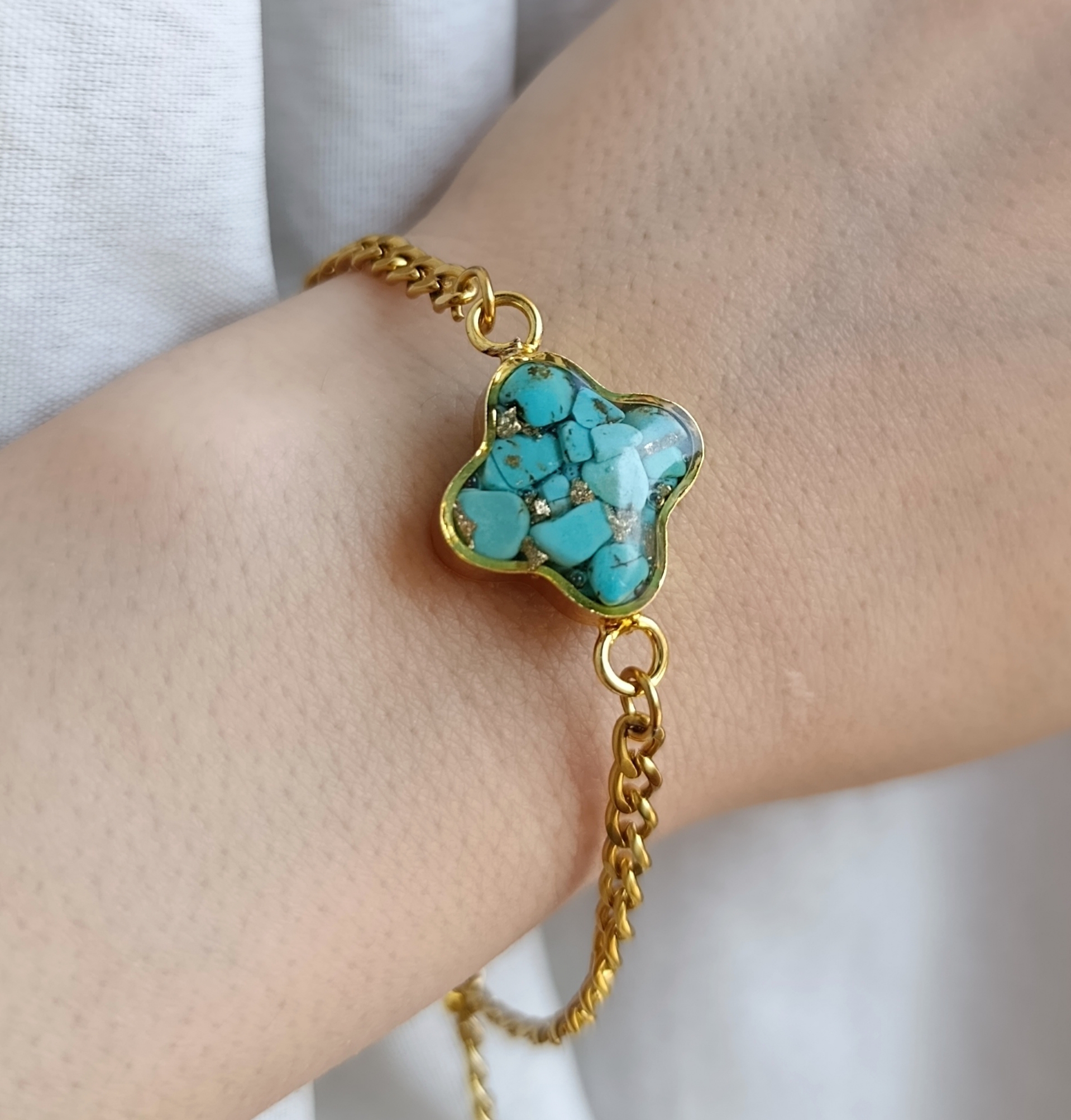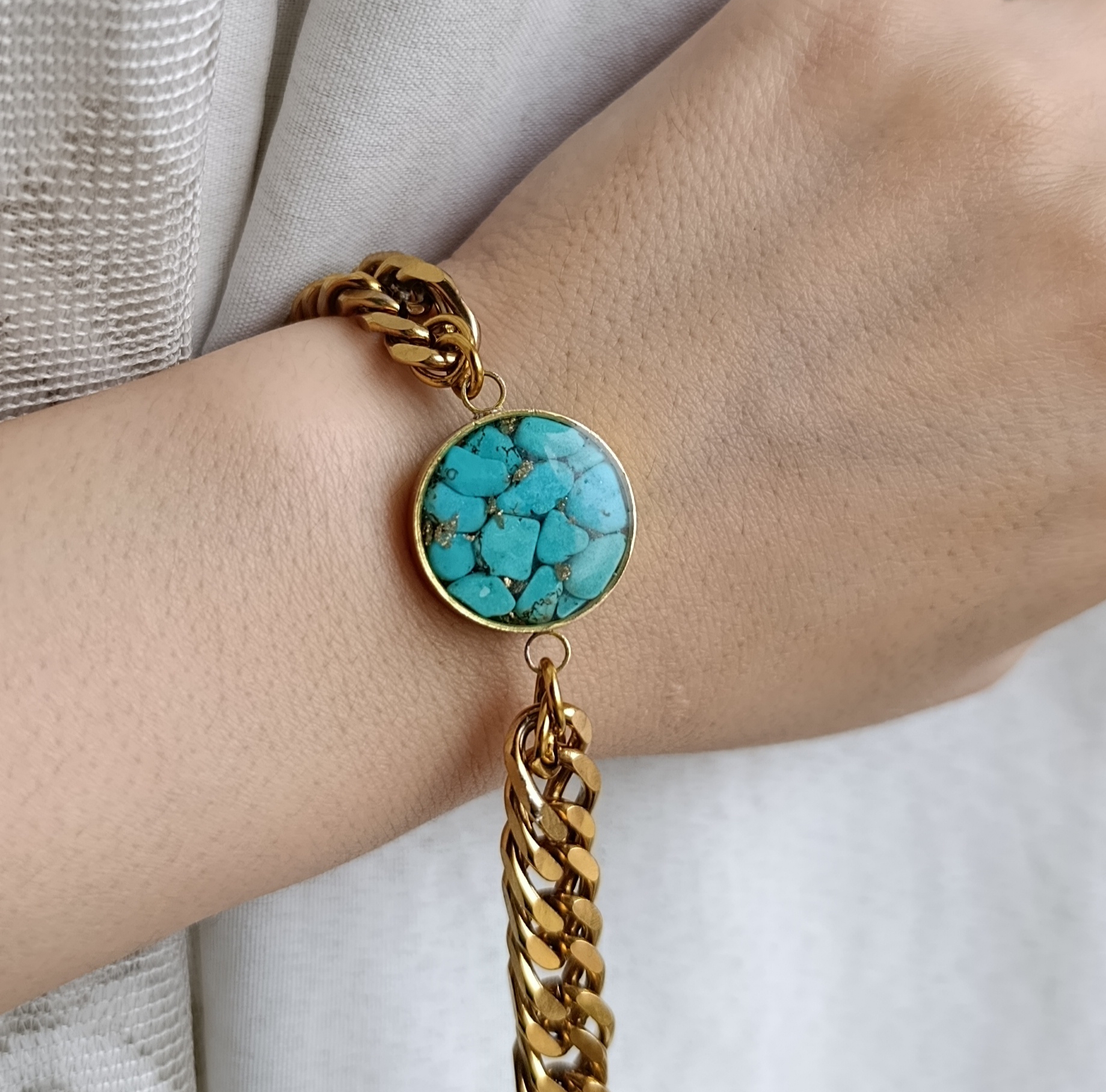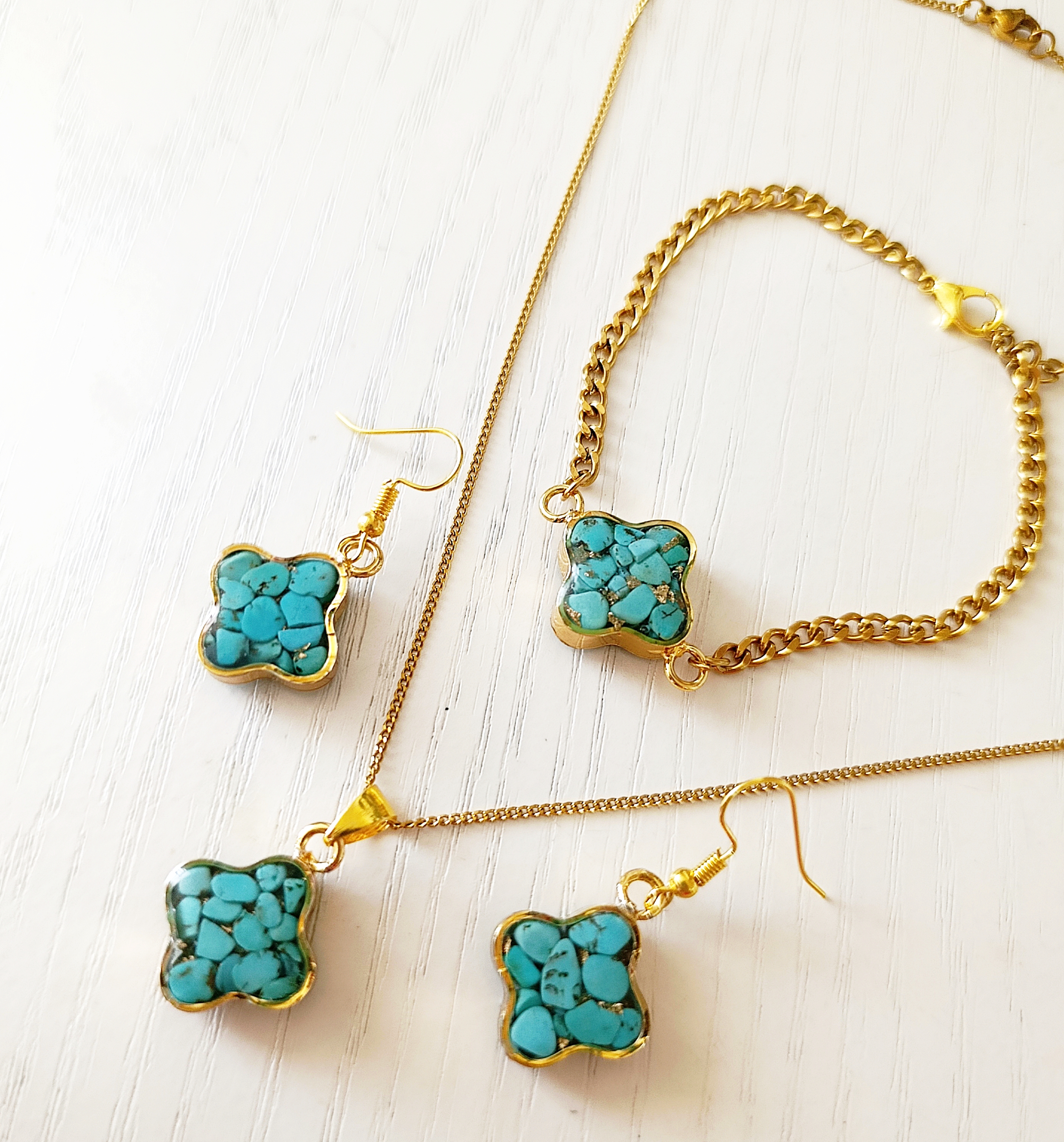 دستبند ونکلیف زنانه سنگ فیروزه با زنجیر طلایی استیل کارتیر ظریف