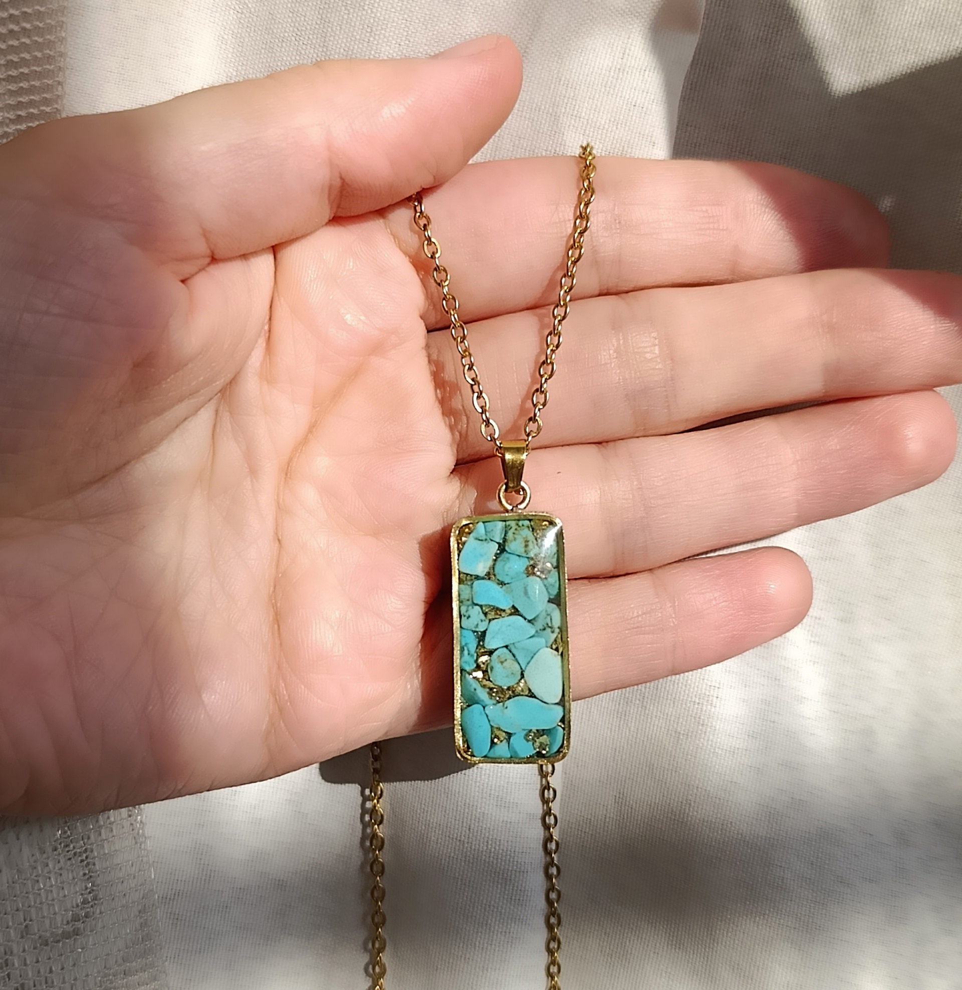 گردنبند پلاک و زنجیر استیل طلایی با سنگ فیروزه اصل طرح مستطیل